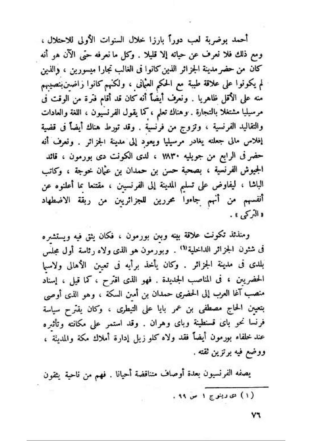 ومنذئذ تكونت علاقة بينه وبين بورمون، فكان يثق فيه ويستشيره في شئون الجزائر الداخلية (¬1). وبورمون هو الذي ولاه رئاسة أول مجلس بلدي في مدينة الجزائر. وكان يأخذ برأيه في تعيين الأهالي ولا سيما الحضريين، في المناصب الجديدة. فهو الذي اقترح، كما قيل، إسناد منصب آغا العرب إلى الحضري حمدان بن أمين السكة، وهو الذي أوصى بتعيين الحاج مصطفى بن عمر بايا على التيطري، وكان يقترح سياسة فرنسا نحو باي قسنطينة وباي وهران. وقد استمر على مكانته وتأثيره عند خلفاء بورمون أيضا فقد ولاه كلوزيل إدارة أملاك مكة والمدينة، ووضع فيه برتزين ثقته.