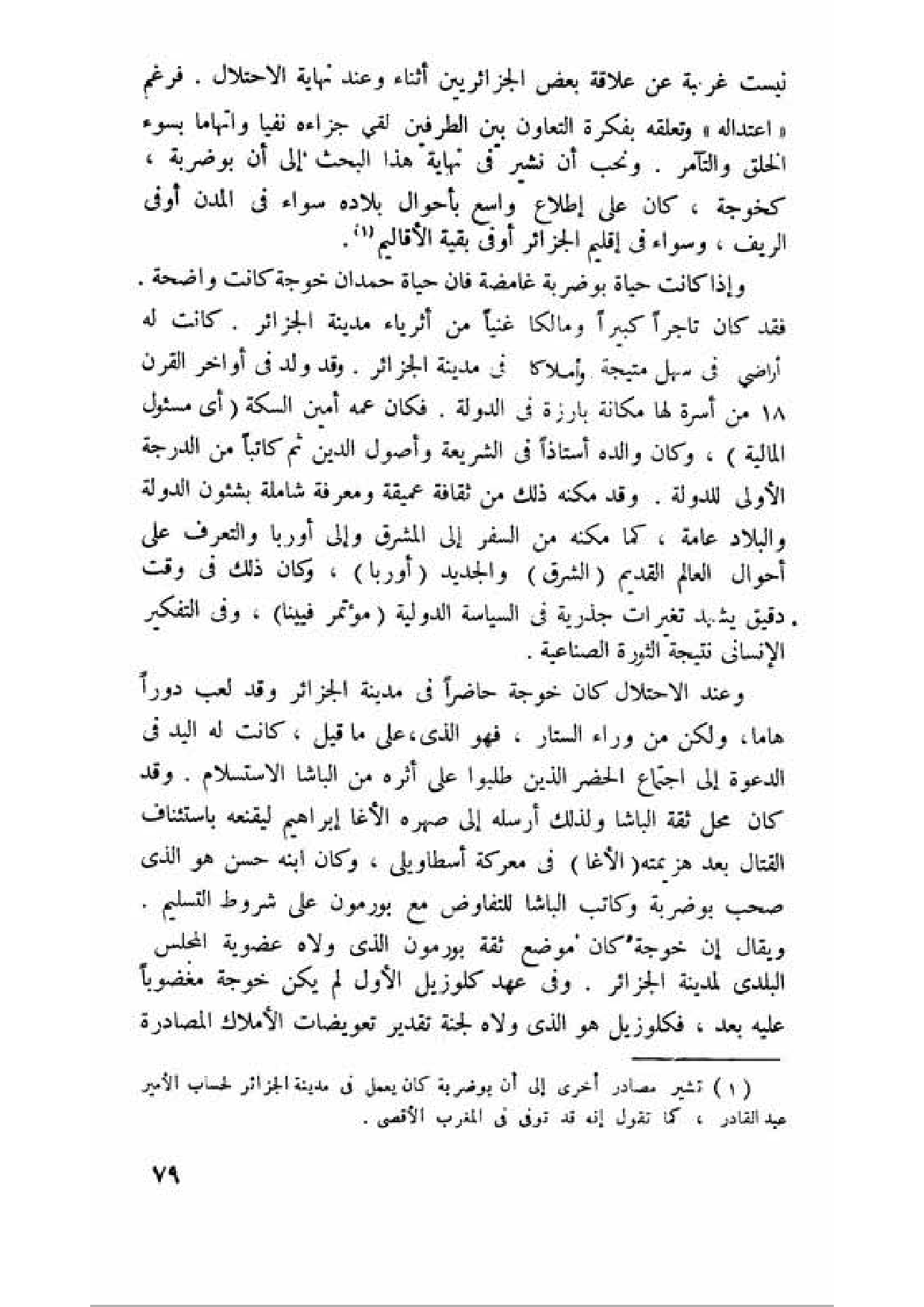ليست غريبة عن علاقة بعض الجزائريين أثناء وعند نهاية الاحتلال. فرغم (اعتداله) وتعلقه بفكرة التعاون بين الطرفين لقي جزاءه نفيا واتهاما بسوء الخلق والتآمر. ونحب أن نشير في نهاية هذا البحث إلى أن بوضربة، كخوجة، كان على إطلاع واسع بأحوال بلاده سواء في المدن أو في الريف، وسواء في إقليم الجزائر أو في بقية الأقاليم (¬1).