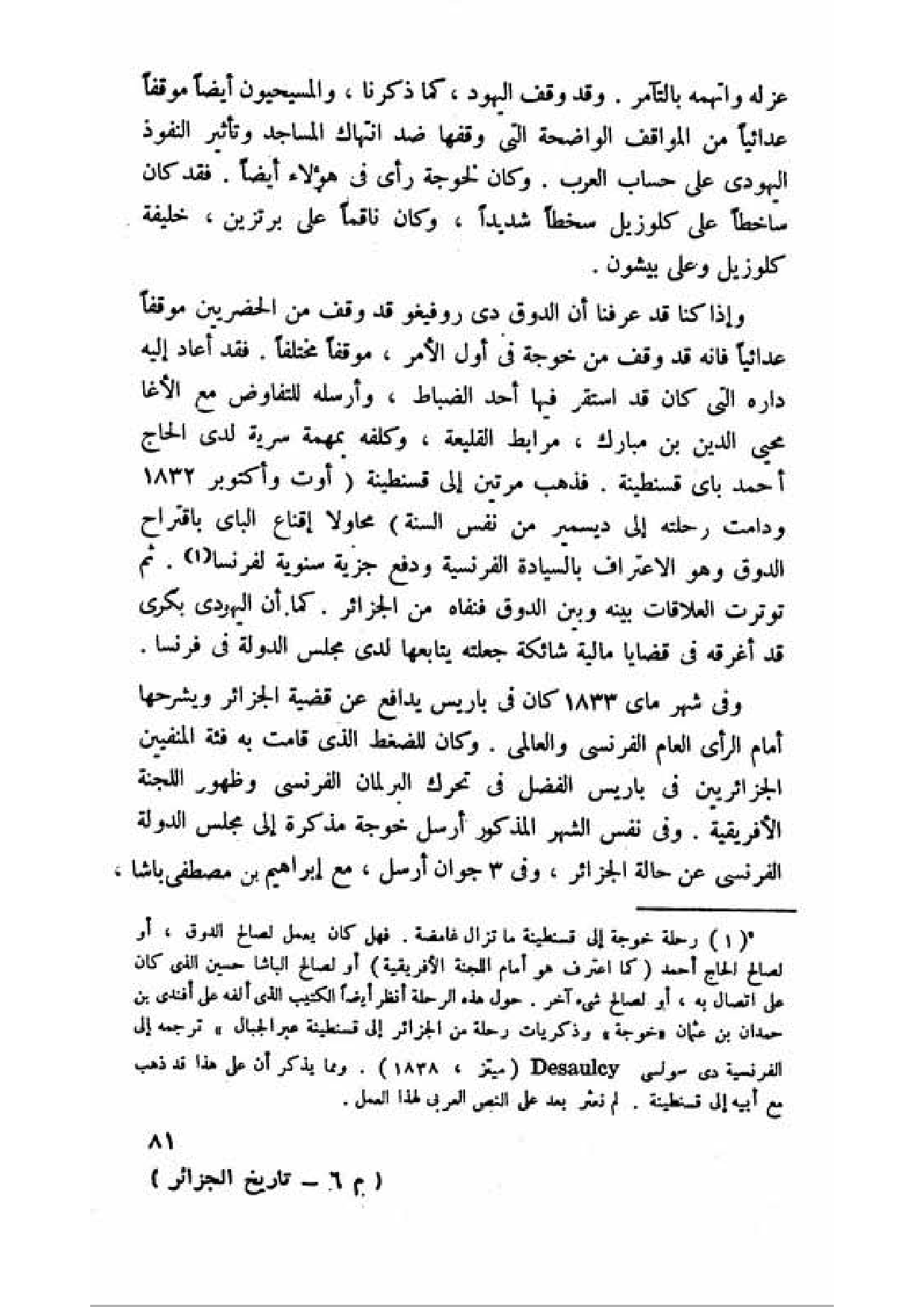 (¬1) رحلة خوجة إلى قسنطينة ما تزال غامضة. فهل كان يعمل لصالح الدوق، أو لصالح الحاج أحمد (كما اعترف هو أمام اللجنة الأفريقية) أو لصالح الباشا حسين الذي كان على اتصال به، أو لصالح شيء آخر. حول هذه الرحلة أنظر أيضا الكتيب الذي ألفه علي أفندي بن حمدان بن عثمان (خوجة) وذكريات رحلة من الجزائر إلى قسنطينة عبر الجبال. ترجمه إلى الفرنسية دي سولسي Desaulcy (ميتز، 1838). ومما يذكر أن على هذا نذهب مع أبيه إلى قسنطينة. لم نعثر بعد على النص العربي لهذا العمل.