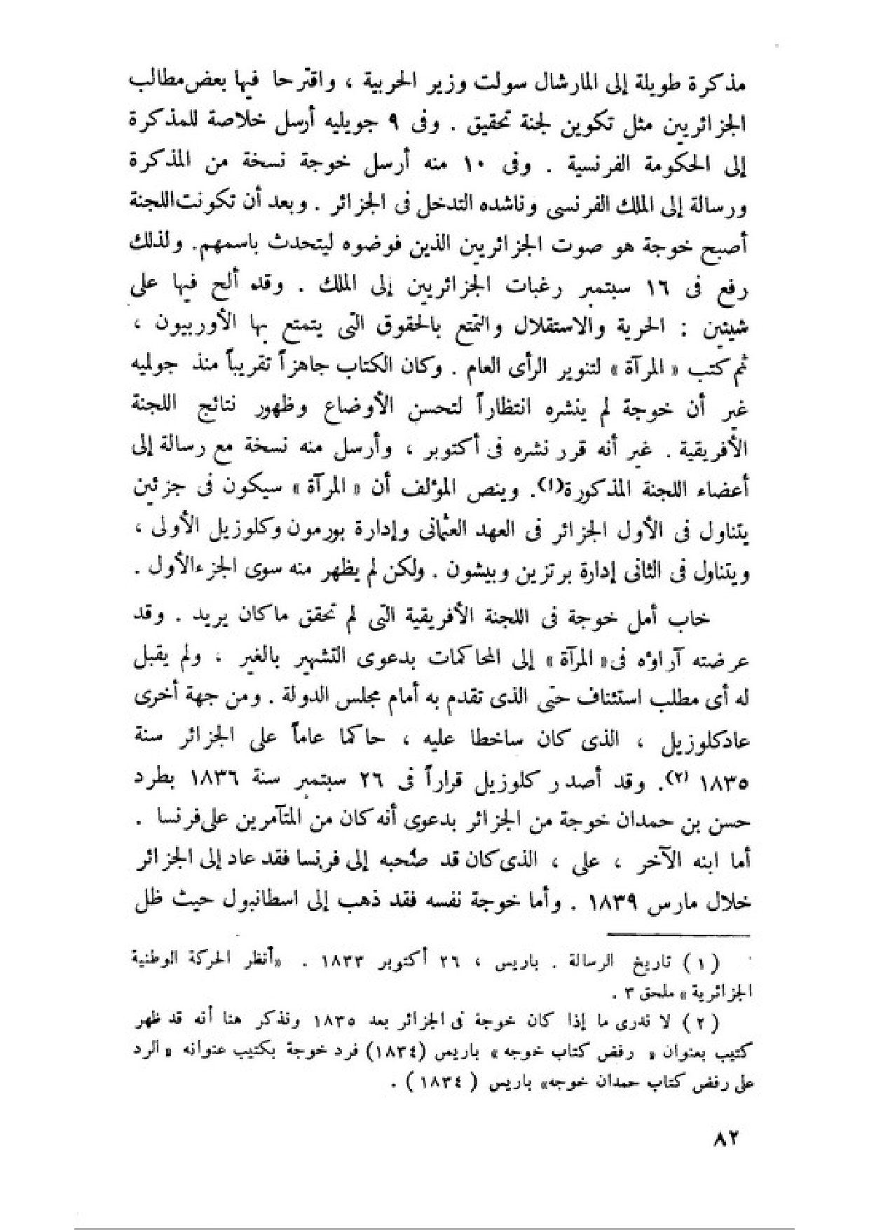 (¬2) لا ندري ما إذا كان خوجة في الجزائر بعد 1835 ونذكر هنا أنه قد ظهر كتيب بعنوان (رفض كتاب خوجه) باريس (1824) فرد خوجة بكتيب عنوانه (الرد على رفض كتاب حمدان خوجه) باريس (1824).