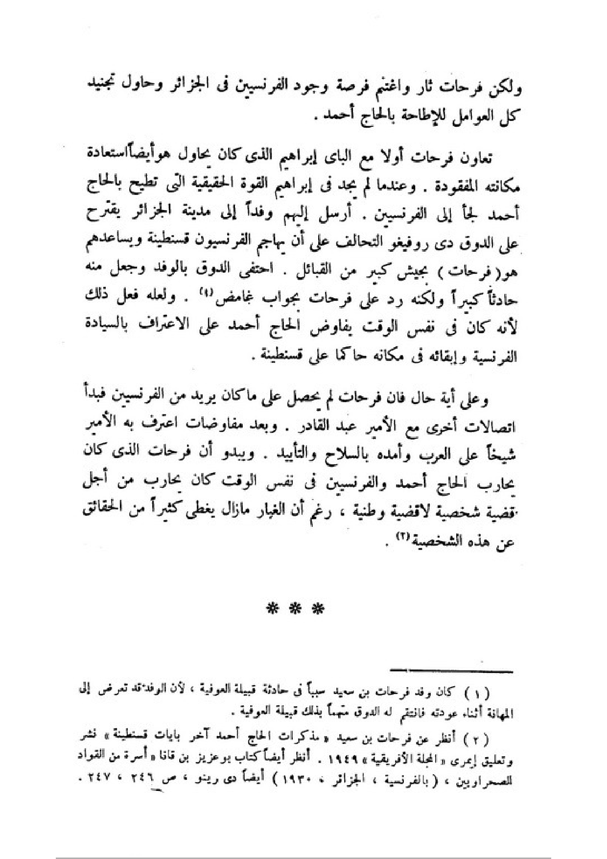 (¬2) أنظر عن فرحات بن سعيد (مذكرات الحاج أحمد آخر بايات قسنطينة) نشر وتعليق إيمري (المجلة الأفريقية) 1949. أنظر أيضا كتاب بوعزيز بن قانا (أسرة من القواد الصحراويين)، (بالفرنسية، الجزائر، 1930) أيضا دي رينو، ص 246، 247.