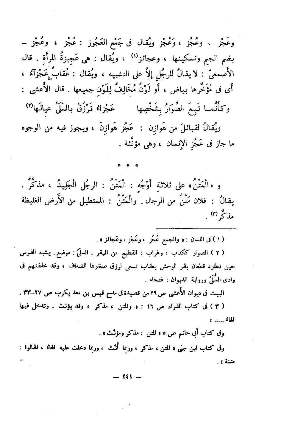 وعَجْز، وعُجُز، وعُجْز ويُقال في جمْع العَجُوز: عُجُز، وعُجْز - بضم الجيم وتسكينها، وعجائز، ويُقال: هي عَجِيزةُ المرأةِ. قال الأصمعي: لا يقالُ للرجلِ إلا على التشبيه، ويقال: عُقابٌ عجزآءُ، أي في مؤخرها بياض، أو لَوْنٌ مخالِفٌ للونِ جميعها. قال الأعشى: