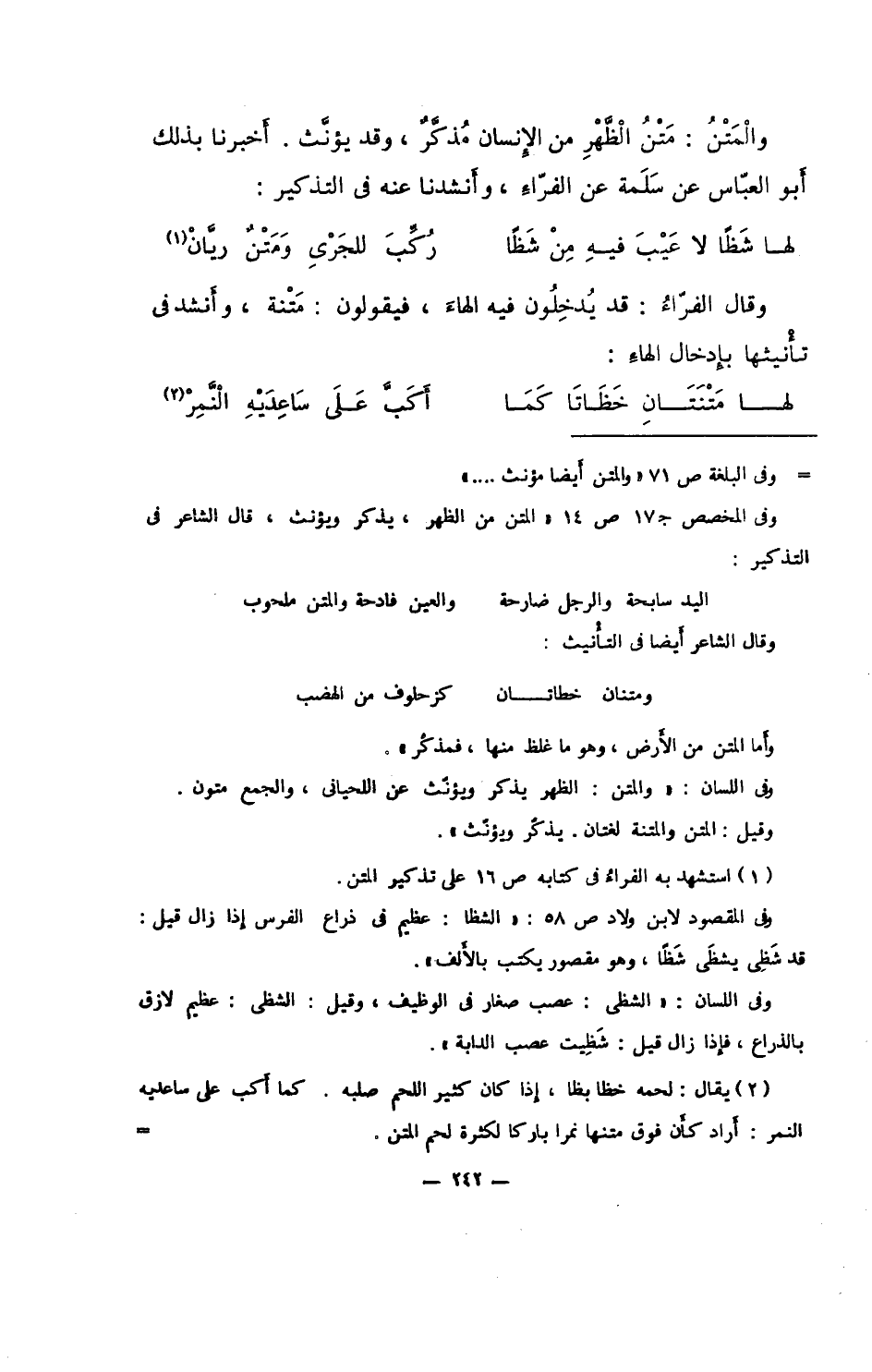 وقال الفراء: قد يُدخِلُون فيه الهاء، فيقولون: مَتْنة، وأنشد في تأنيثها بإدخال الهاء:
