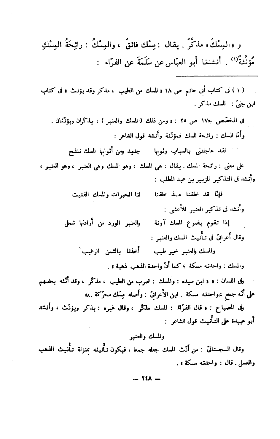و"المِسْكُ" مذكرٌ. يقال: مِسْك فائقٌ، والمِسْكُ: رائِحَةُ المِسْكِ مؤنثةٌ. أنشدنا أبو العباس عن سلمة عن الفراء: