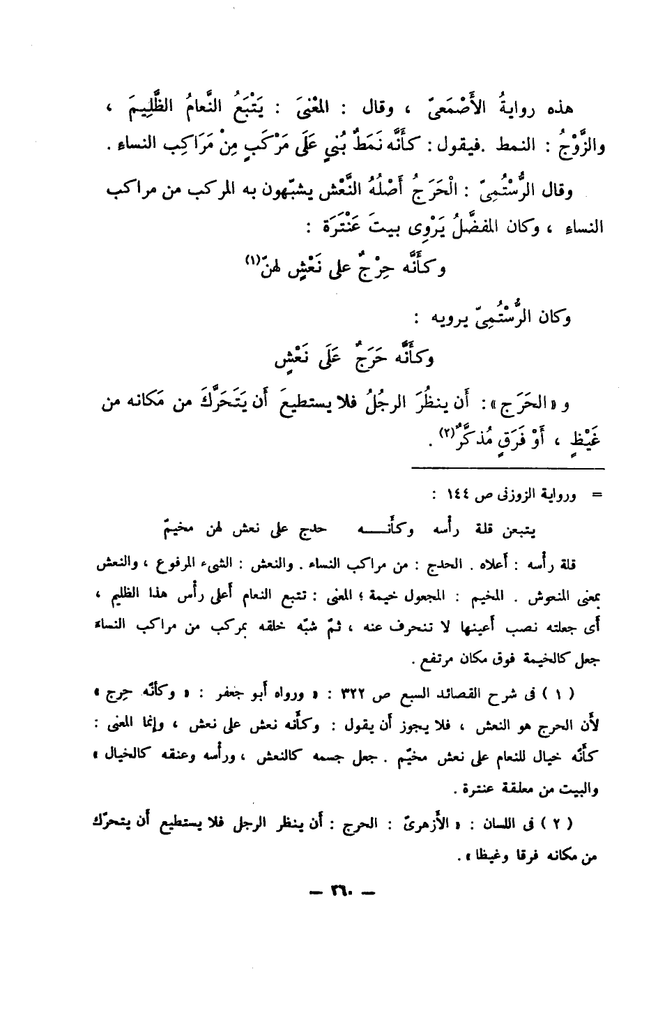 هذه رواية الأصمعي، وقال: المعنى: يَتْبَعُ النعامُ الظليمَ، والزوْجُ: النمط. فيقول: كأنه نمطٌ بُنيٍ على مركبٍ من مراكب النساء.