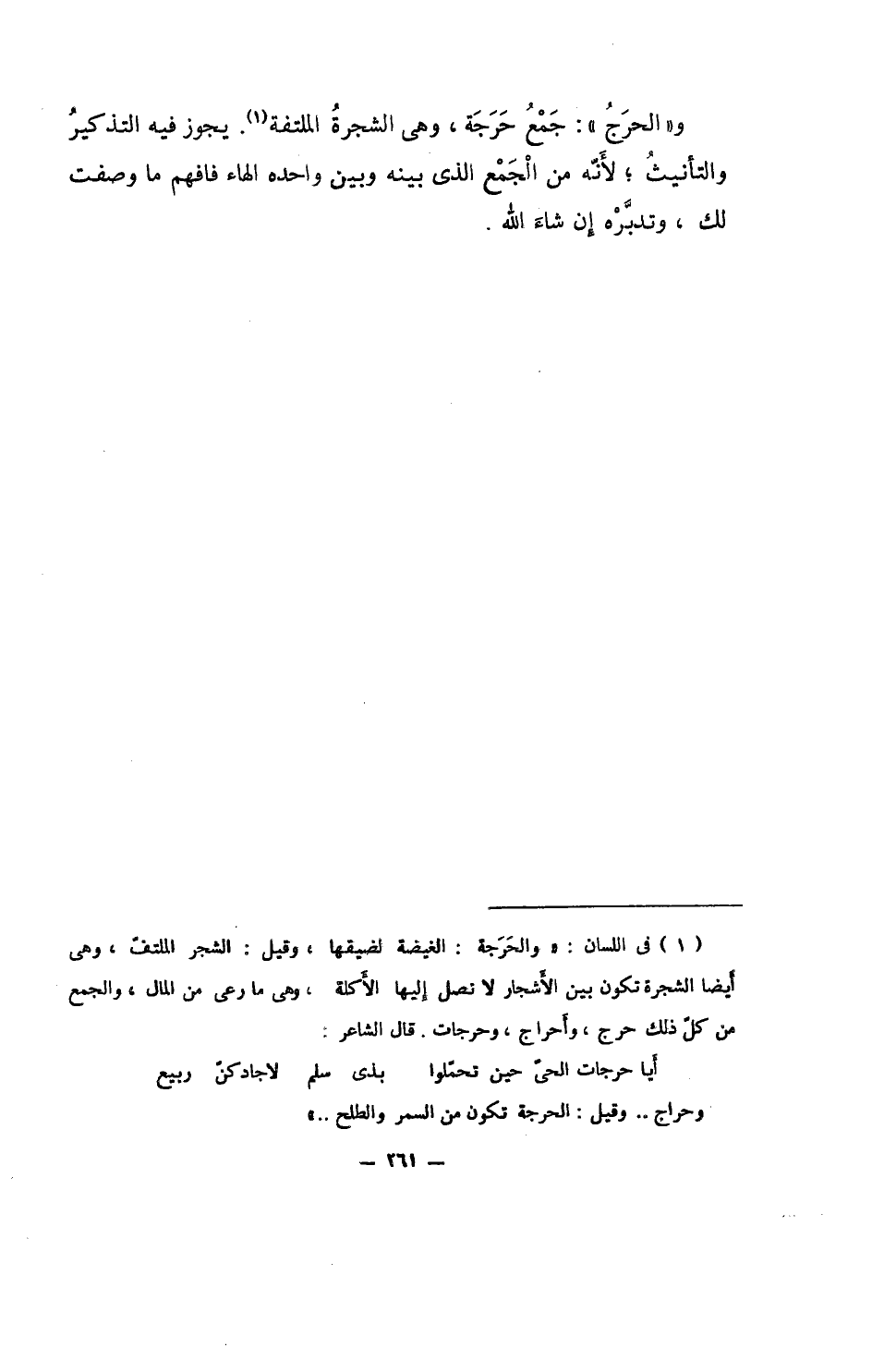 و"الحَرجُ": جَمْعُ حرجة، وهي الشجرةُ الملتفة. يجوز فيه التذكيرُ والتأنيثُ؛ لأنه من الجَمْع الذي بينه وبين واحده الهاء فافهم ما وصفت لك، وتدبره إن شاء الله.