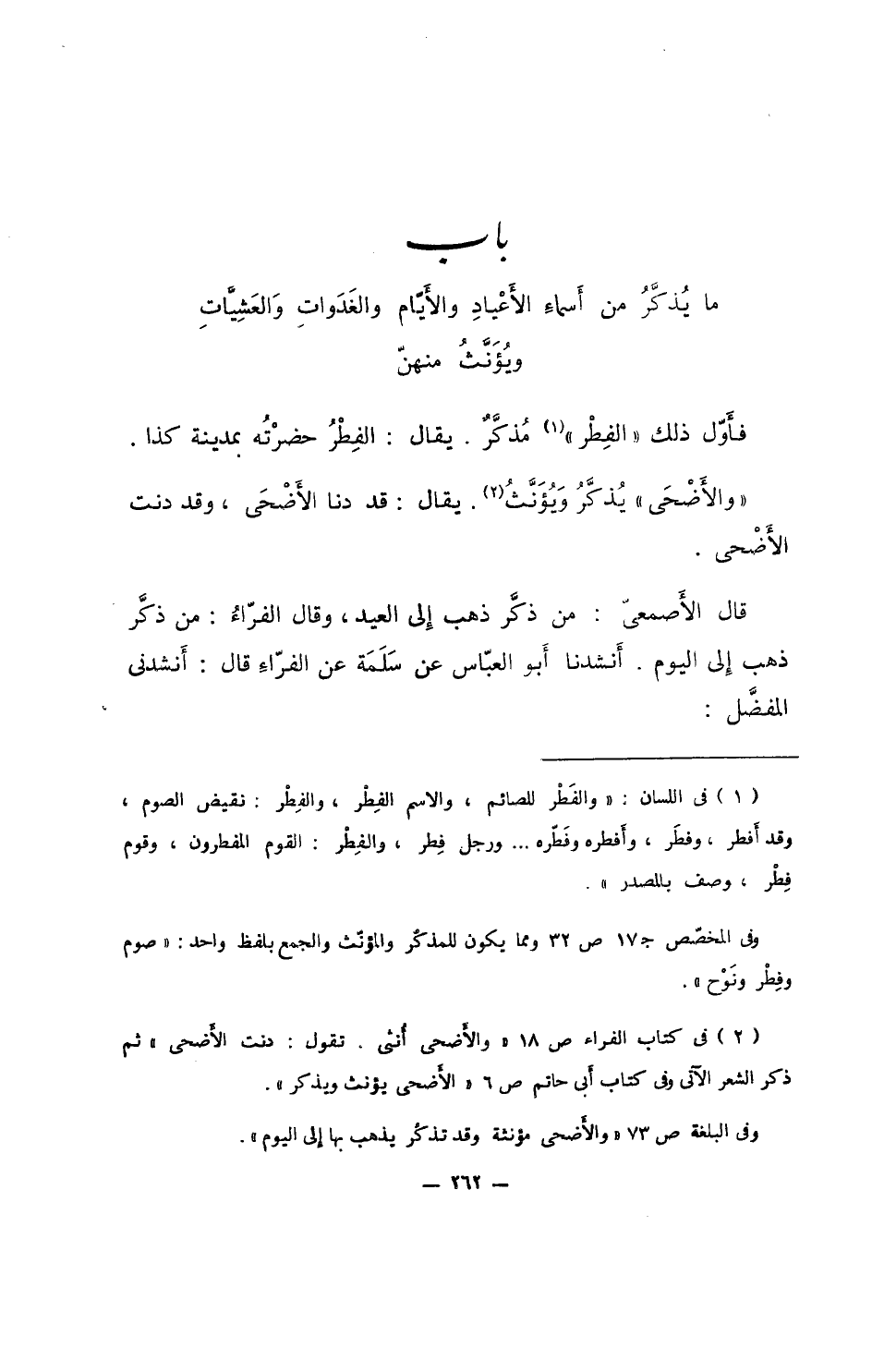 قال الأصمعي: من ذكر ذهب إلى العيد، وقال الفراءُ: من ذكر ذهب إلى اليوم. أنشدنا أبو العباس عن سلمة عن الفراء قال: أنشدني المفضل: