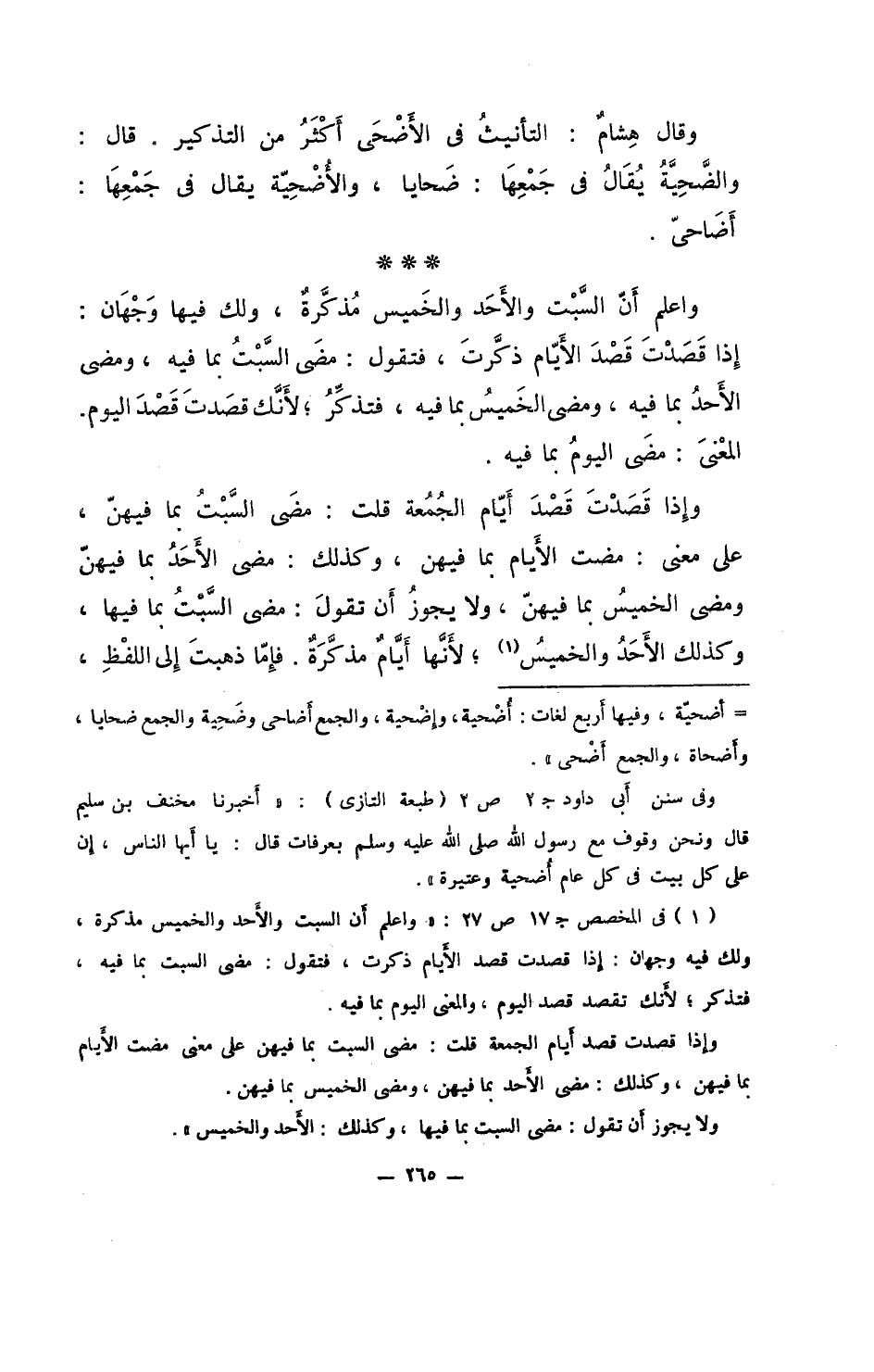 واعلم أن السبت والأحد والخميس مُذكرةٌ، ولك فيها وجهان: إذا قصدْتَ قصْدَ الأيام ذكرتَ، فتقول: مضى السبتُ بما فيه، ومضى الأحدُ بما فيه، ومضى الخميسُ بما فيه، فتذكرُ؛ لأنك قصدتَ قصْدَ اليوم. المعنى: مضى اليومُ بما فيه.