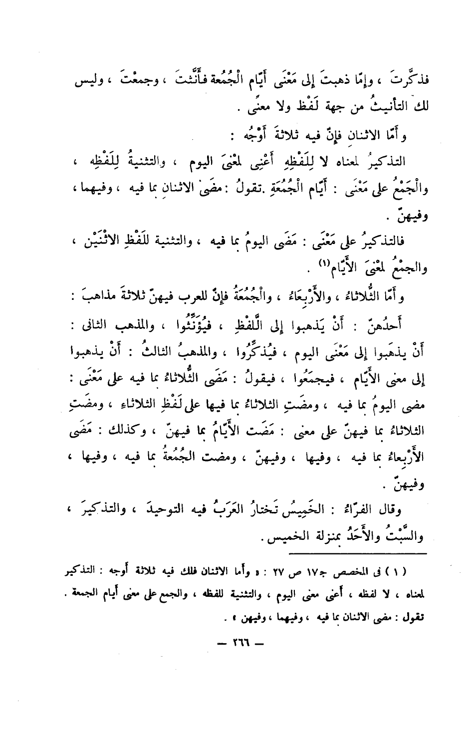 التذكيرُ لمعناه لا للفظه أعني لمعنى اليوم، والتثنية للفظه، والجمعُ على معنى: أيام الجمعة. تقول: مضى الاثنان بما فيه، وفيهما، فويهن.
