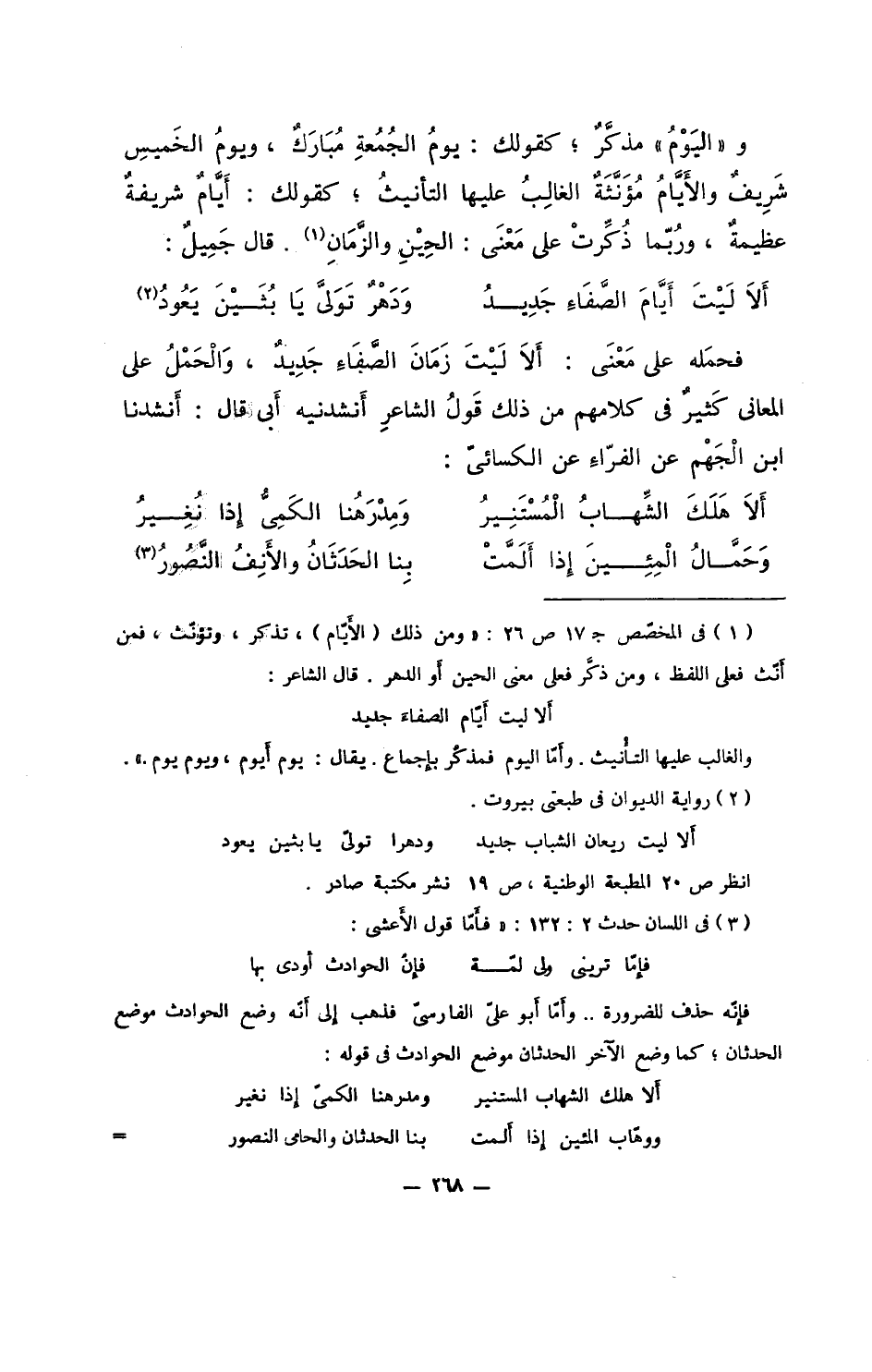 و"اليومُ" مذكرٌ؛ كقولك: يومُ الجمعةِ مباركٌ، ويومُ الخميس شريفٌ والأيامُ مؤنثةُ الغالبُ عليها التأنيث؛ كقولك: أيامٌ شريفةٌ عظيمةٌ، وربما ذُكِّرتْ على معنى: الحين والزمان. قال جميلُ:
