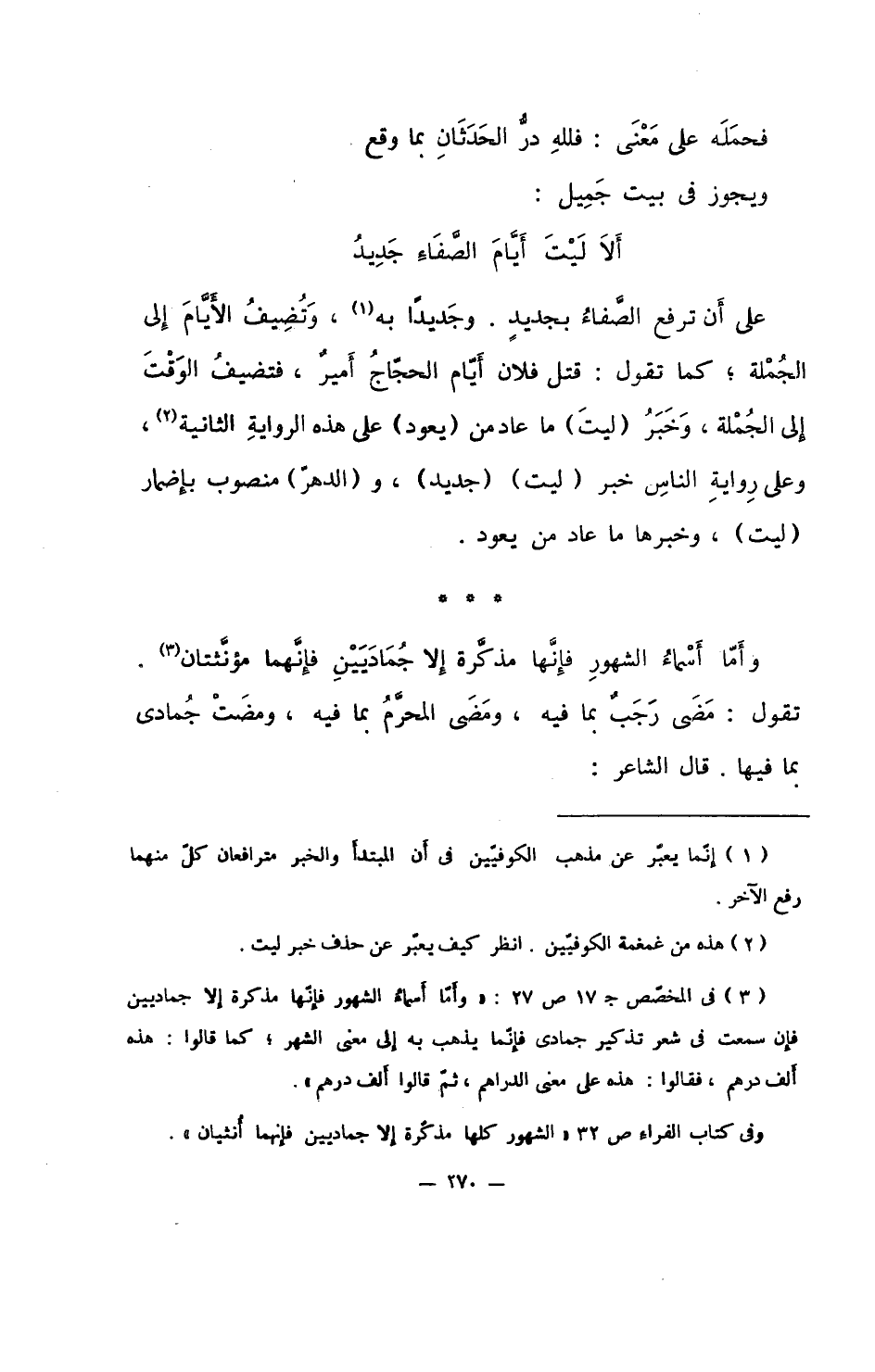 وأما أسماء الشهور فإنها مذكرة إلا جماديين فإنهما مؤنثتان. تقول: مضى رجبٌ بما فيه، ومضى الحرمُ بما فيه، ومضتْ جمادي بما فيه. قال الشاعر: