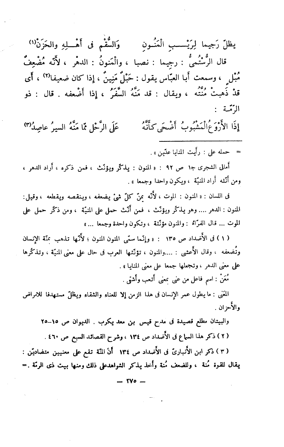 قال الرستمي: رجيماً: نصبا، والمنونُ: الدهر، لأنه مضعفٌ مبلٍ، وسمعت أبا العباس يقول: حبلٌ منينُ، إذا كان ضعيفاً، أي قدْ ذهبتْ منته، ويقال: قد منه السفر، إذا أضعفه. قال: ذو الرمة: