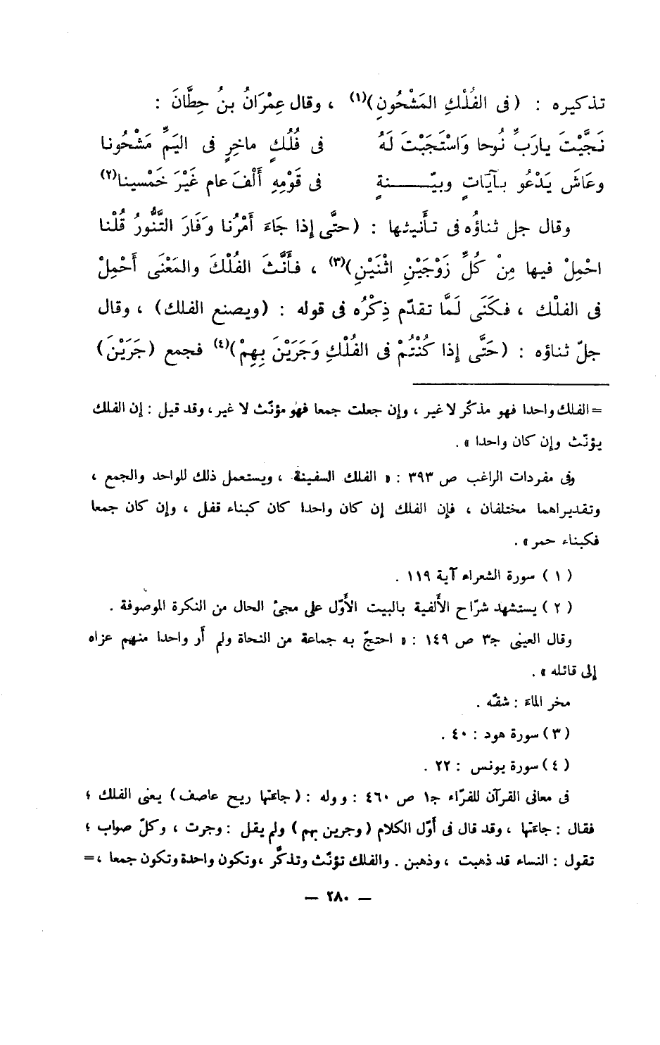 وقال جل ثناؤه في تأنيثها: (حتى إذا جاء أمرنا وفار التنورُ قلنا احملُ فيها من كل زوجين اثنين)، فأنث الفلك والمعنى أحملْ في الفلك، فكنى لما تقدم ذكره في قوله: (ويصنع الفلك)، وقال جل ثناؤه: (حتى إذا كنتمْ في الفُلْكِ وجرينَ بهمْ) فجمع (جَرَيْنَ)
