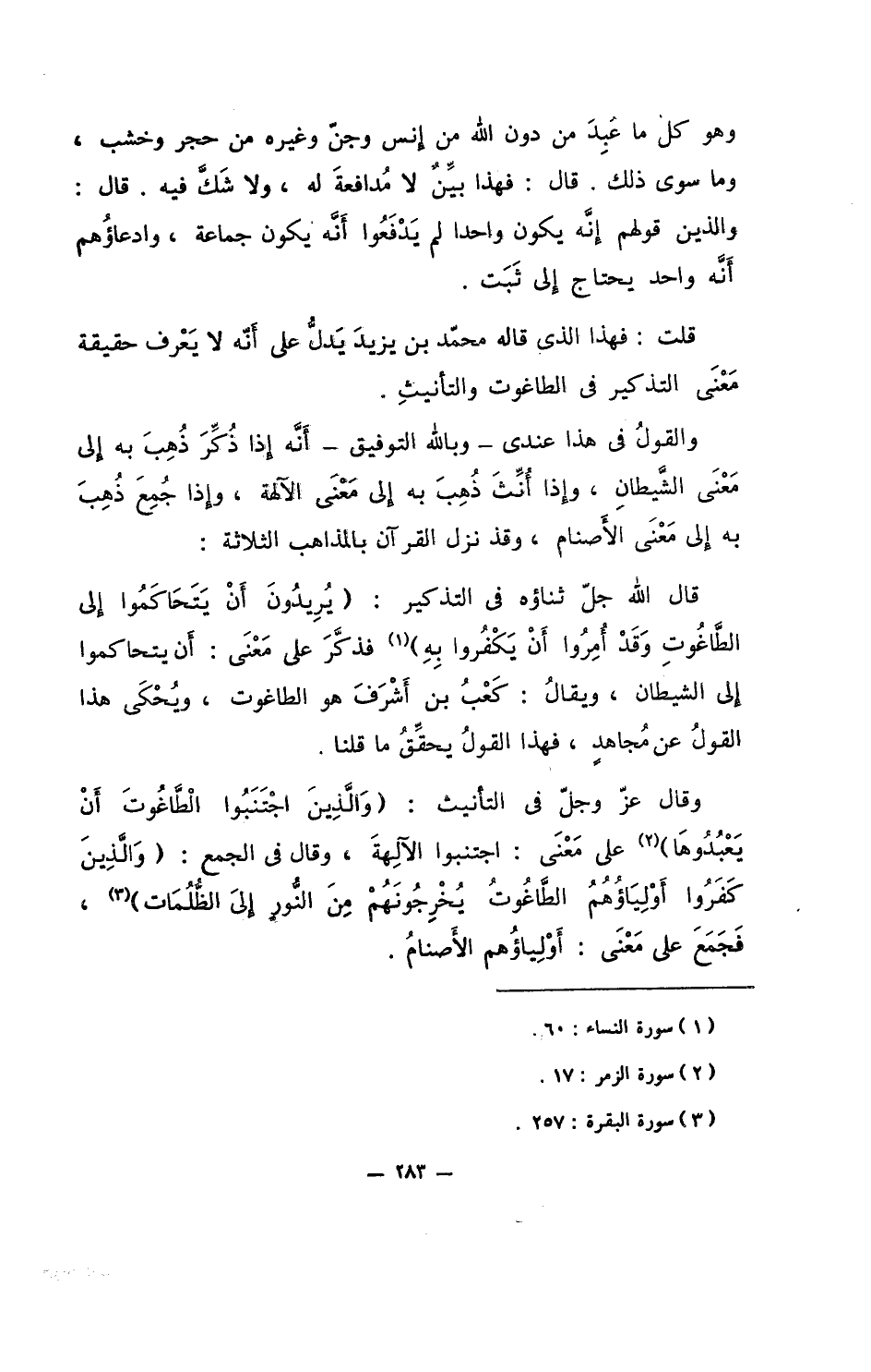 قلت: فهذا الذي قاله محمد بن يزيد يدلُّ على أنه لا يعرف حقيقة مَسْنَى التذكير في الطاغوت والتأنيث.