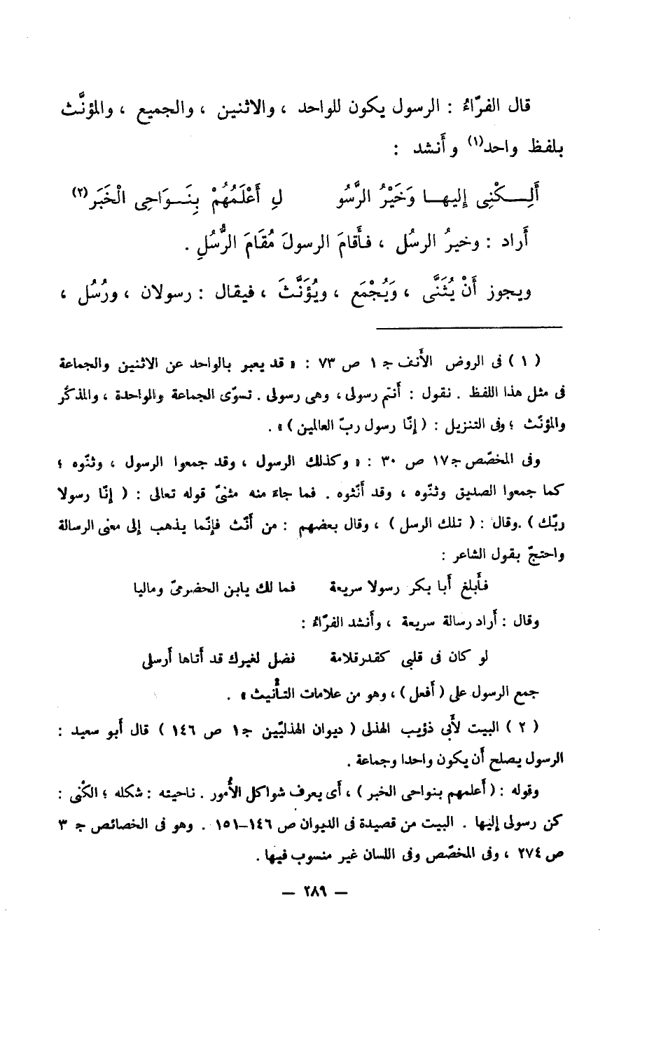 قال الفراء: الرسول يكون للواحد، والاثنين، والجميع، والمؤنث بلفظ واحد وأنشد: