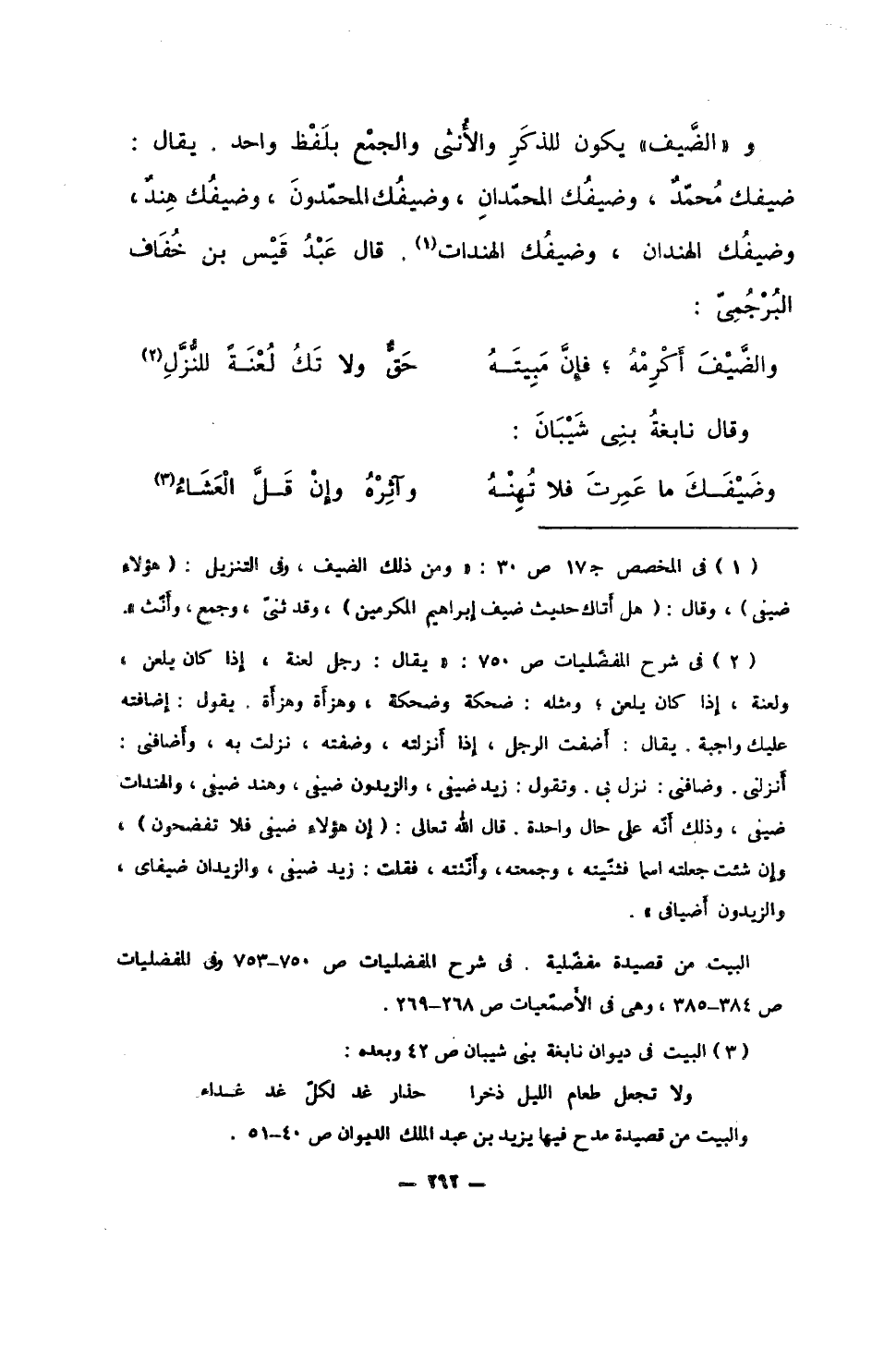 و"الضيف" يكون للذكر والأنثى والجمع بلفظ واحد. يقال: ضيفك محمدٌ، وضيفكُ المحمدان، وضيفك المحمدون، وضيفك هند، وضيفك الهندان، وضيفك الهندات، قال عبد