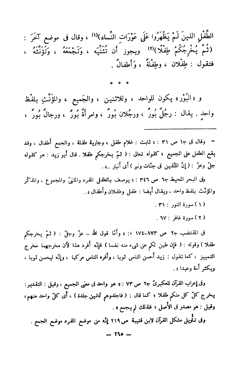 الطفل الذين لم يظهروا على عورات النساء)، وقال في موضع آخر: (ثم يخرجكم طفلاً) ويجوز أن تثنيه، وتجمعه، وتؤنثه، فتقول: طفلان، وطفلةٌ، وأطفالٌ.