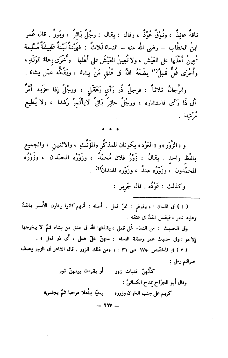 ناقةٌ عائذٌ، ونوقٌ عُوْذٌ، وقال: يقال: رجلٌ بائرٌ، وبورٌ. قال عمر ابن الخطاب - رضي الله عنه- النساء ثلاث: فهينةٌ لينةٌ عفيفةٌ مسلِمة تُعِينُ أهلها على العيش، ولا تعينُ العيش على أهلها. وأخرى وعاء للولد، وأخرى غُلُّ قَمِلٌ يضعه الله في عنق من يشاء، ويفكه عمن يشاء.