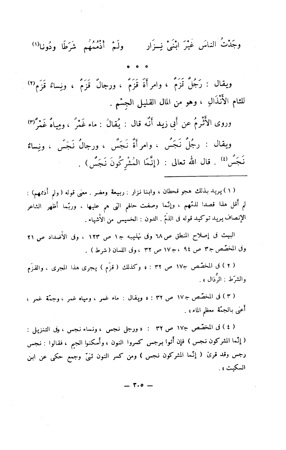 ويقال: رجلٌ نجسٌ، وامرأةٌ نجس، ورجالٌ نجس، ونساءُ نجس. قال الله تعالى: (إنما المشركون نجس).