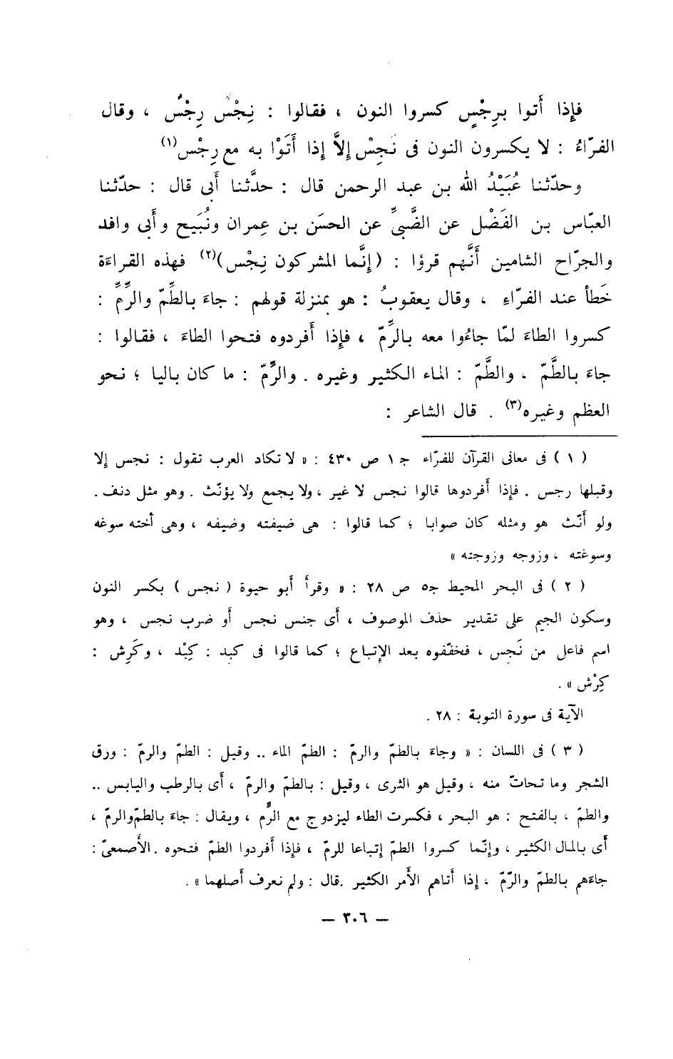وحدثنا عبيد الله بن عبد الرحمن قال: حدثنا أبي قال: حدثنا العباس بن الفضل عن الضبي عن الحسن بن عمران ونبيح وأبي وافد والجراح الشامين أنهم قرؤا: (إنما المشركون نجس) فهذه القراءة خطأ عند الفراء، قوال يعقوب: هو بمنزلة قولهم: جاء بالطم والرم: كسروا الطاء لما جاءوا معه بالرم، فإذا أفردوه فتحوا الطاء، فقالوا: جاء بالطم، والطم: الماء الكثير وغيره. والرم: ما كان بالياً، نحو العظم وغيره. قال الشاعر: