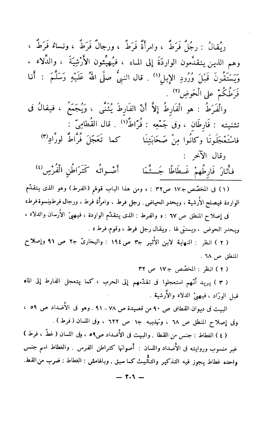 ويقال: رجلٌ فرطٌ، وامرأةٌ فرطٌ، ورجالٌ فرطٌ، ونساءٌ فرطٌ، وهم الذين يتقدمون الواردة إلى الماء، فهيئون الأرشية، والدلاء، ويستقون قبل ورود الإبل. قال النبي صلى الله عليه وسلم: أنا فرطكم على الحوض.