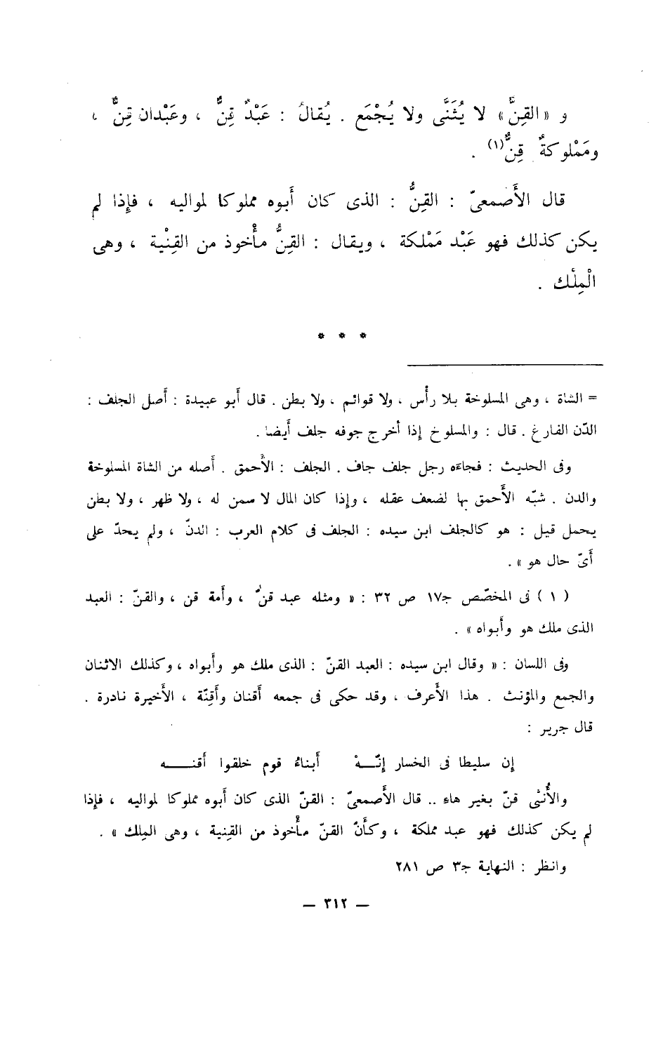 و"القن، لا يثنى ولا يجمع. يقال: عبدٌ قِنٌّ، وعبدان قِنٌّ، ومملوكةٌ قِنٌّ.