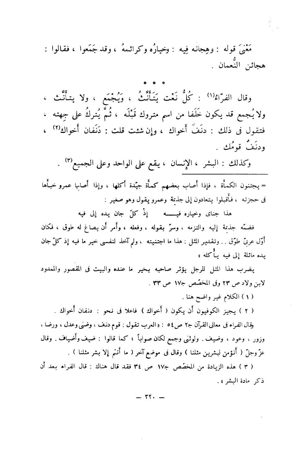 وقال الفراء: كُلُّ نعت يتأنثُ، ويجمع، ولا يتأنث، ولا يجمع قد يكون خلفاً من اسم متروك قبله، ثم يترك على جهته، فتقول في ذلك: دنف أخواك، وإن شئت قلت: دنفان أخواك، ودنفٌ قومُك.