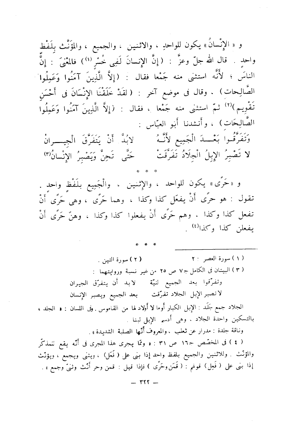 و"الإنسانُ" يكون للواحدِ، والاثنين، والجميع، والمؤنث بلفظ واحد. قال الله جل وعز: (إن الإنسان لفي خسر) فالمعنى: إن الناس؛ لأنه استثنى منه جمعاً فقال: (إلا الذين آمنوا وعملوا الصالحات)، وقال في موضع آخر: (لقد خلقنا الإنسان في أحسن تقويم) ثم استثنى منه جمعا، فقال: (إلا الذين آمنوا وعملوا الصالحات)، وأنشدنا أبو العباس: