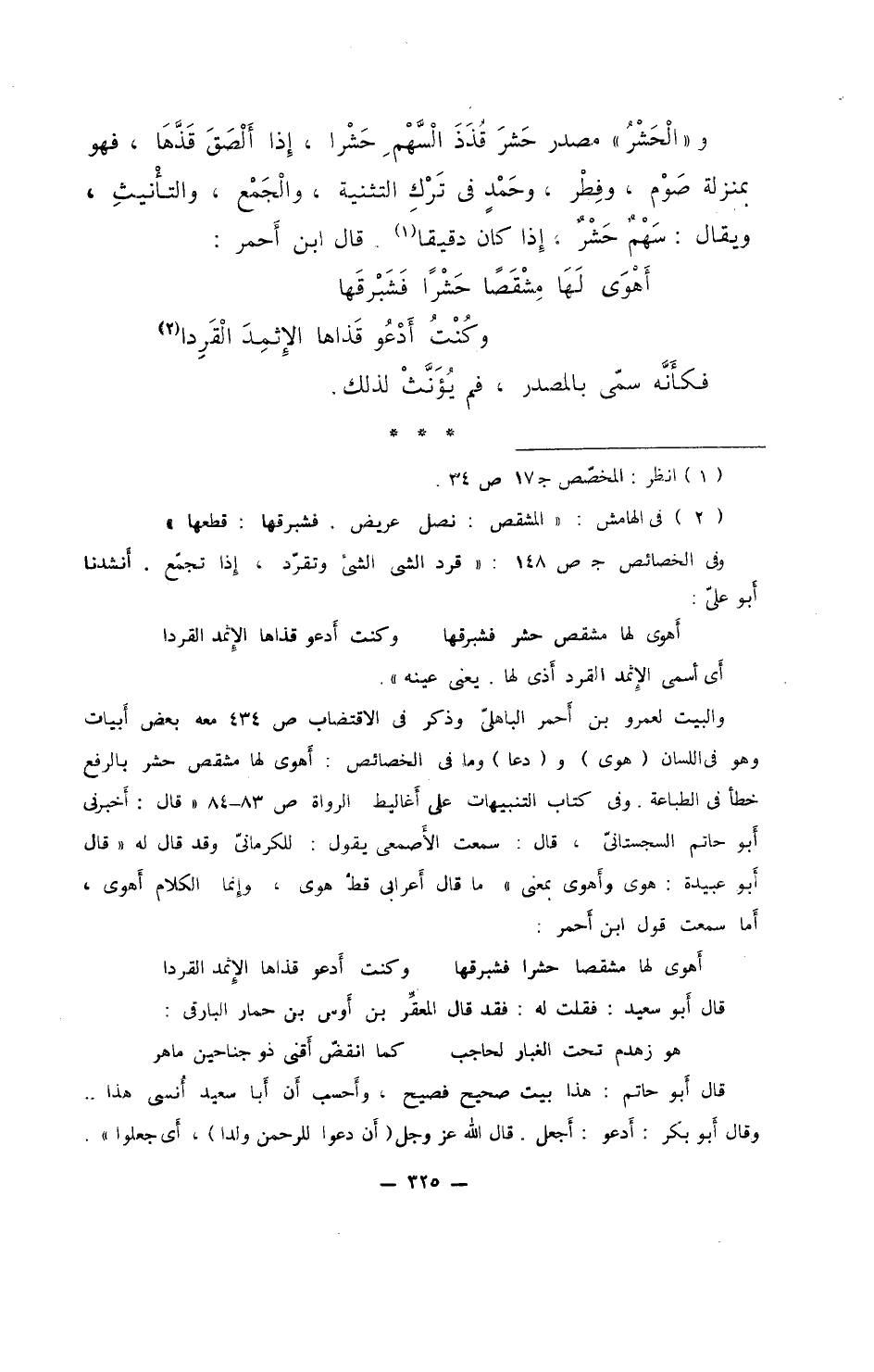 و"الحَشْرُ" مصدر حشر قُذَذَ السهم حشرا، إذا ألصق قذها، فهو بمنزلة صوم، وفطر، وحمد في ترك التثنية، والجمع، والتأنيث، ويقال: سهمٌ حشرٌ، إذا كان دقيقاً. قال ابن أحمر: