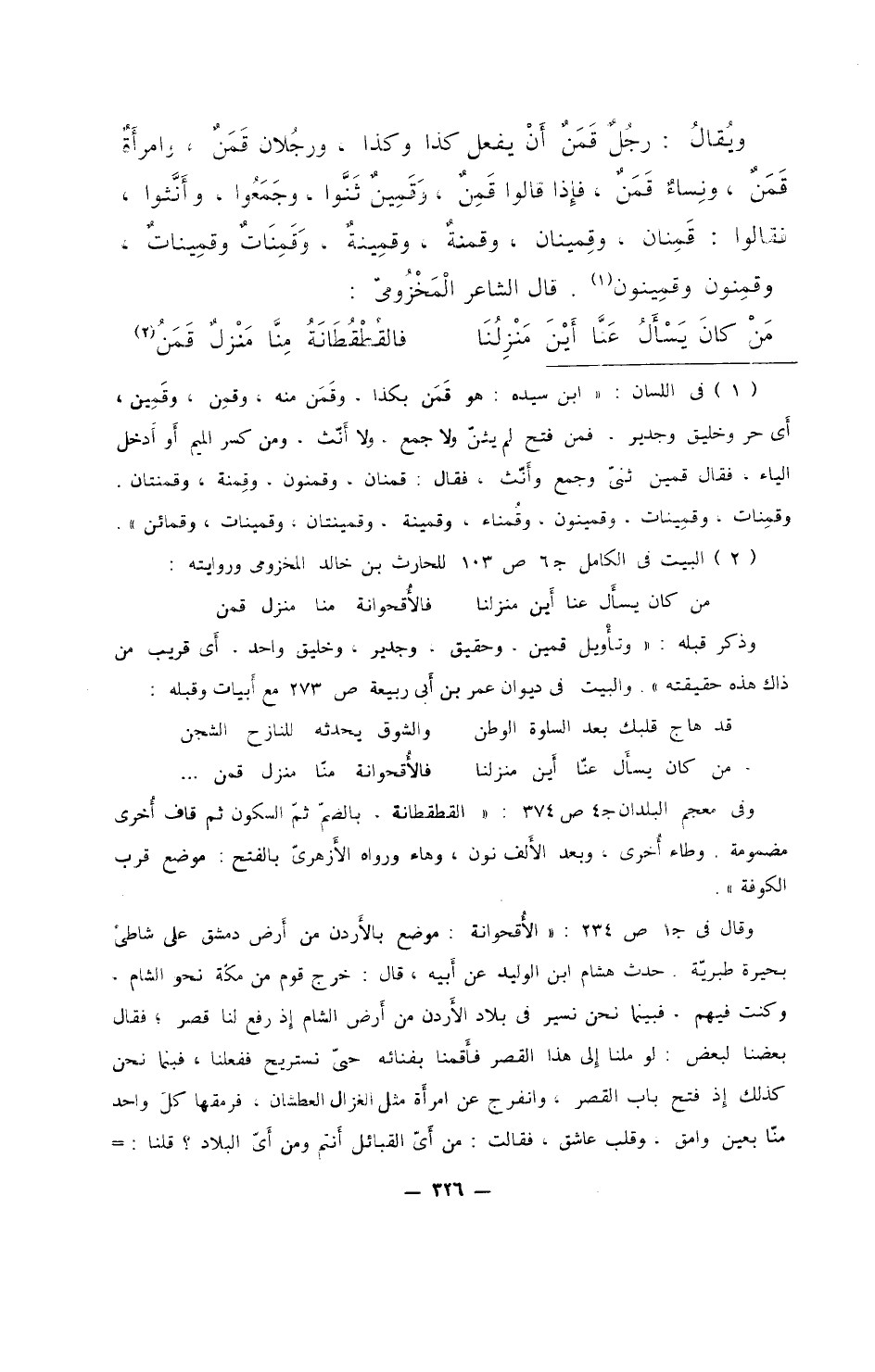 ويقال: رجلٌ قَمَنٌ أن يفعل كذا وكذا. ورجلان قَمنٌ، وامرأةٌ قمنٌ، ونساءٌ قَمَنٌ، فإذا قالوا قَمِنٌ، وقمِينٌ ثنوا، وجمعوا. وأنثوا، فقالوا: قَمِنان. وقمينان، وقمنةٌ، وقمينةٌ، وقَمِنَاتٌ وقميناتٌ، وقمنون وقمينون، قال الشاعر المخزومي: