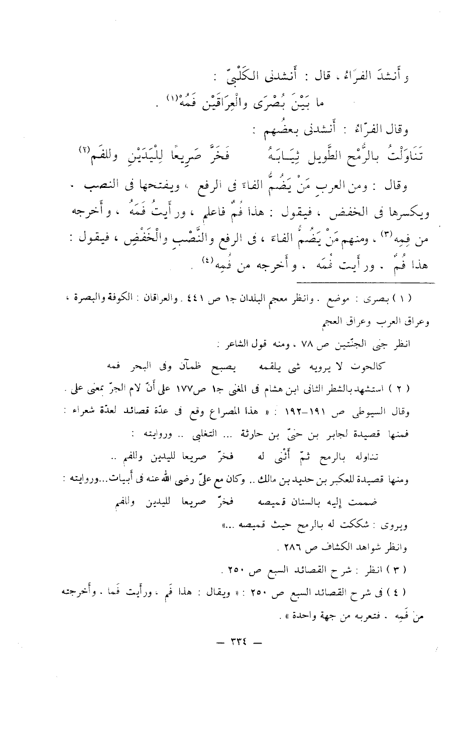 وقال: ومن العربِ مَنْ يضُمُّ الفاء في الرفع، ويفتحها في النصب. ويكسرها في الخفض، فيقول: هذا فُمٌ فاعلم، ورأيتُ فمَهُ، وأخرجه من فِمهِ، ومنهم مَنْ يَضُمُّ الفاء، في الرفع والنصبِ والخفضِ، فيقول: هذا فُمٌّ، ورأيت فُمَه، وأخرجه من فُمِه.