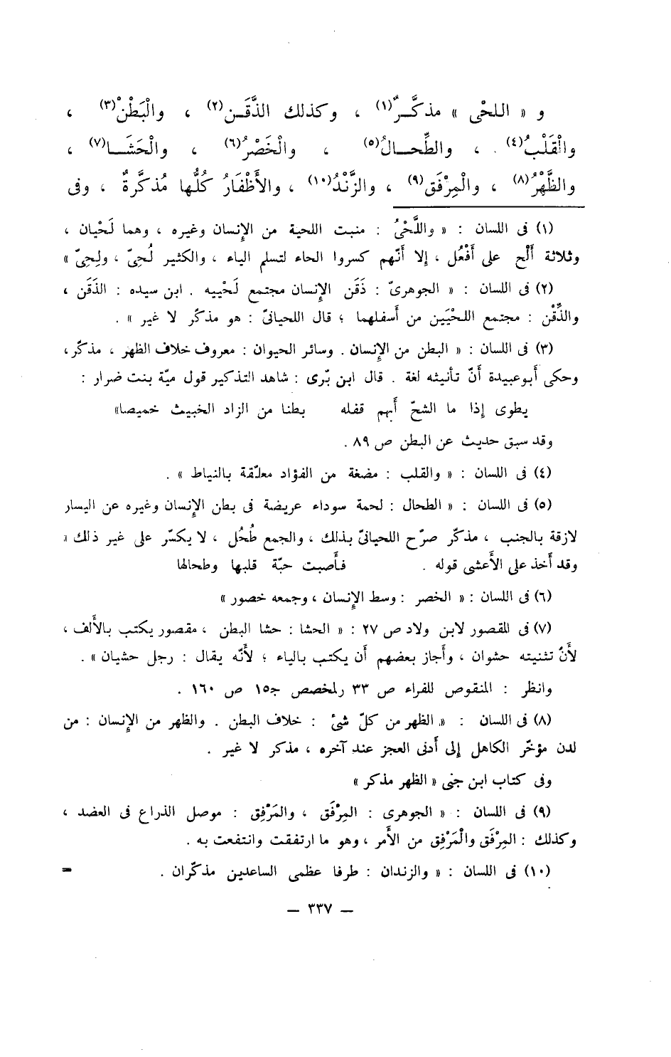 و"اللحي" مذكرٌ، وكذلك الذَّقَن، والبَطْنْ، والقَلْبُ، والطِّحالُ، والخَصْرُ، والحَشَا، والظَّهْرُ، والمِرْفَق، والزَّنْدُ، والأظْفَارُ كلها مُذكرةٌ، وفي