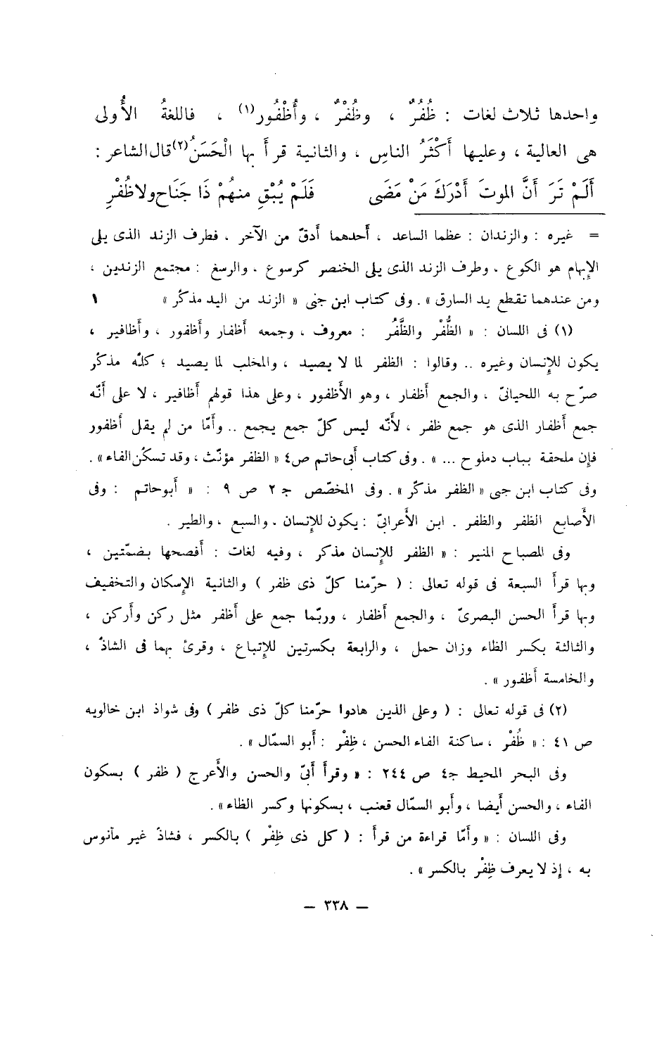 واحدها ثلاث لغات: ظُفُرٌ، وظُفْرٌ، وأُظْفُور، فاللغة الأولى هي العالية، وعليها أكْثَرُ الناسِ، والثانية قرأ بها الحسنُ قال الشاعر: