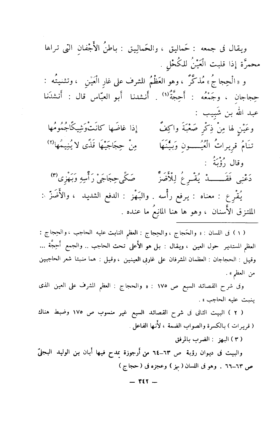 "والْحِجاجُ" مُذكرٌ، وهو العَظْمُ المشرف على غارٍ الْعَيْنِ، وتثنيتُه: حجاجانِ، وجَمْعُه: أحِجَّةٌ. أنشدنا أبو العباس قال: أنشدنا عبد الله بن شبيب: