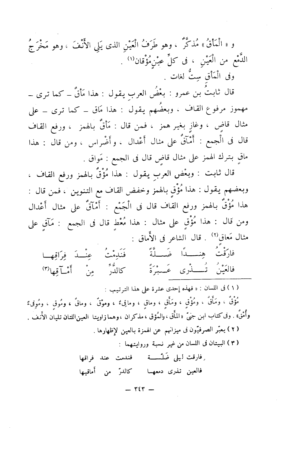 قال ثابتُ بن عمرو: بعْضُ العربِ يقول: هذا مَأقٌ - كما ترى - مهموز مرفوع القاف، وبعضهم يقول: هذا ماق - كما ترى - على مثال قاضٍ، وغازٍ بغير همز، فمن قال: مَأقٌّ بالهمز، ورفع القاف قال في الجمع: أمْآقٌ على مثال أعْدال، وأضْراس، ومن قال: هذا ماقٍ بترك الهمز على مثال قاضٍ قال في الجمع: مَواق.