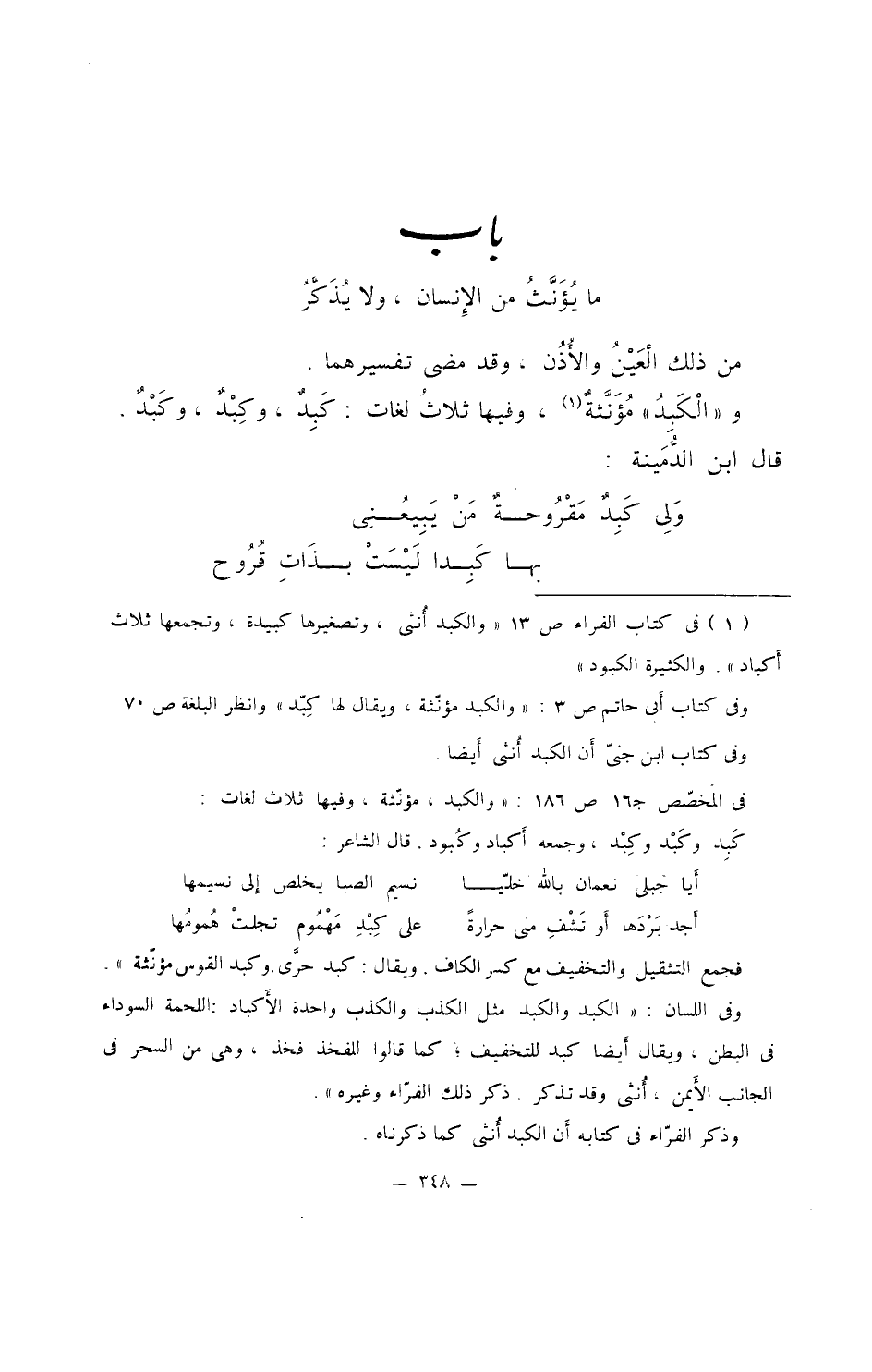 و"الكَبِدُ" مؤنثةٌ، وفيها ثلاثُ لغات: كَبِدٌ، وكِبْدٌ، وكَبْدٌ، قال ابن الدمينة: