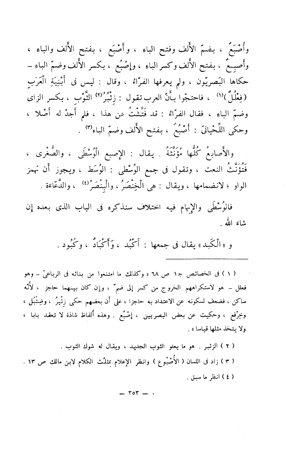 وأصبعٌ، بضم الألف وفتح الباء، وأصبع، بفتح الألف والباء، وأصبعٌ، بفتح الألف وكسر الباء، وإصبُع، بكسر الألف وضم الباء - حكاها البصريون، ولم يعرفها الفراءُ، وقال: ليس في أبنية العرب (فِعْلُلٌ)، فاحتجوا بأن العرب تقول: زِئْبُرُ الثوبِ، بكسر الزاي وضم الباء، فقال الفراء: قد فتَّشْتُ عن هذا، فلم أجدْ له أصلا، وحكى اللحياني: أصْبُعٌ، بفتح الألف وضم الباء.