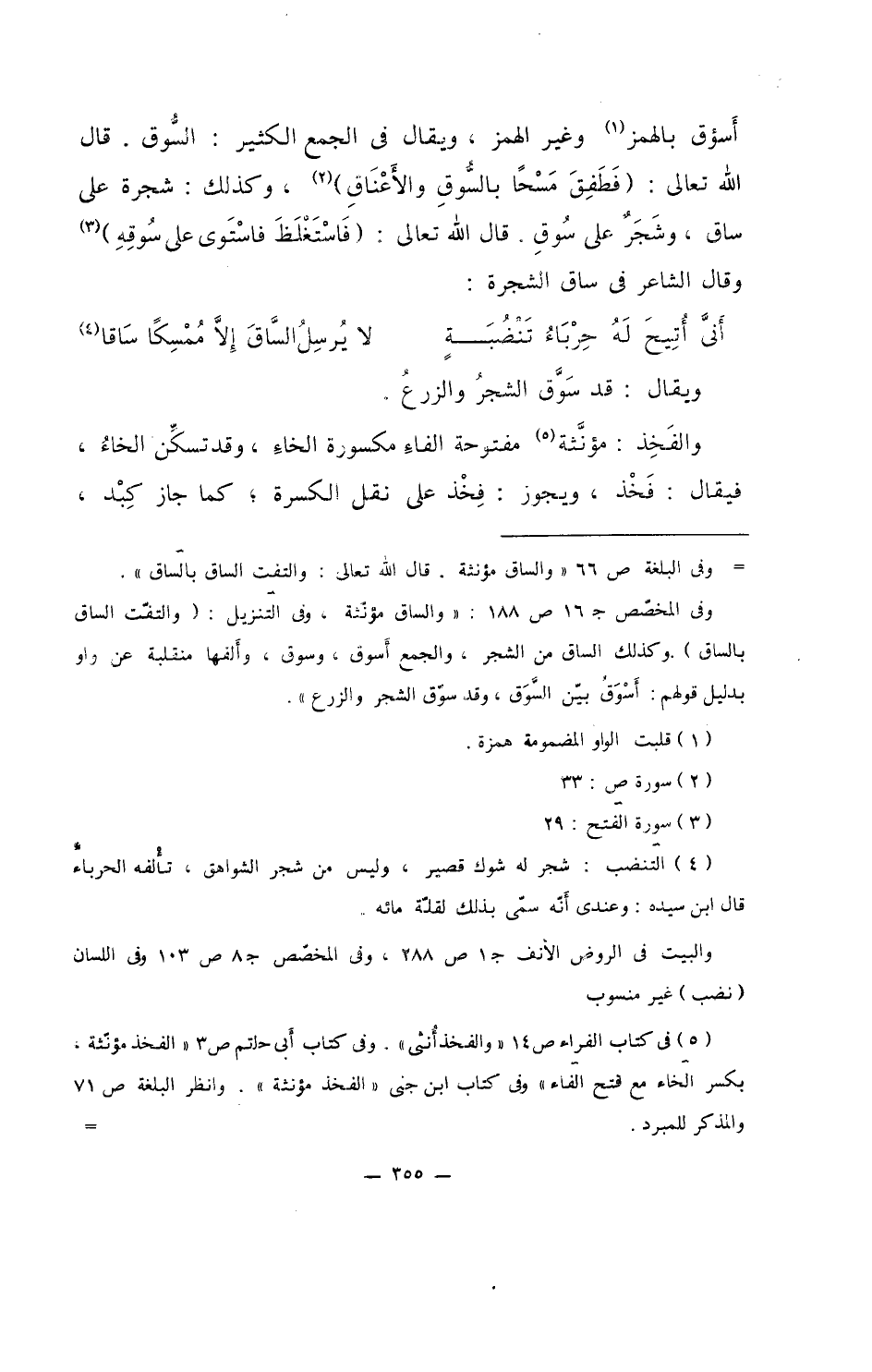 أسؤق بالهمز وغير الهمز، ويقال في الجمع الثكير: السوق. قال الله تعالى: (فطفق مسحاً بالسوق والأعناقِ)، وكذلك: شجرة على ساق، وشجرٌ على سوقِ. قال الله تعالى: (فاستغلظ فاستوى على سوقه) وقال الشاعر في ساق الشجرة: