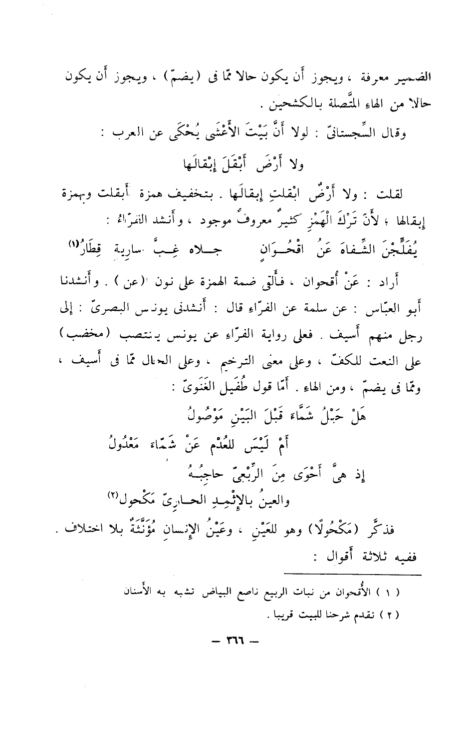 أراد: عَنْ أقحوان، فألقى ضمة الهمزة على نون (عن). وأنشدنا أبو العباس: عن سلمة عن الفراء قال: أنشدني يونس البصري: إلى رجل منهم أسيف. فعلى رواية الفراء عن يونس ينتصب (مخضب) على النعت للكف، وعلى معنى الترخيم، وعلى الحال مما في أسيف، ومما في يضم، ومن الهاء. أما قول طفيل الغنوي: