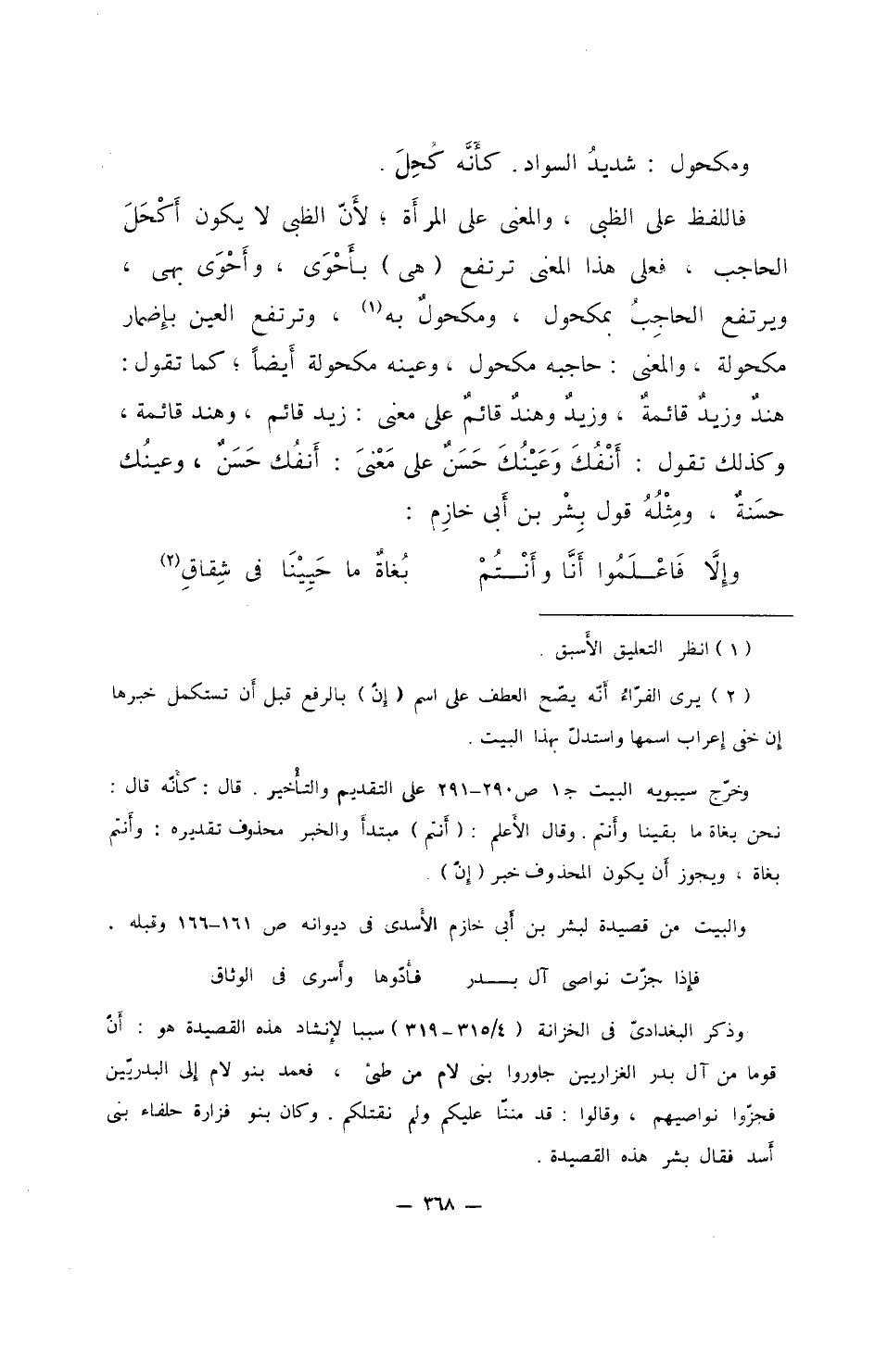 فاللفظ على الظبي، والمعنى على المرأة؛ لأن الظبي لا يكون أكْحَلَ الحاجب، فعلى هذا المعنى ترتفع (هي) بأحْوَى، وأحْوَى بهي، ويرتفع الحاجِبُ بمكحول، ومكحولٌ به، وترتفع العين بإضمار مكحولة، والمعنى: حاجبه مكحول، وعينه مكحولة أيضاً؛ كما تقول: هندٌ وزيدٌ قائمةٌ، وزيدٌ وهندٌ قائمٌ على معنى: زيد قائم، وهند قائمة، وكذلك تقول: أنْفُكَ وعيْنُكَ حسنٌ على معنى: أنفُك حسنٌ، وعينُك حسنةٌ، ومِثْلُهُ قول بشر بن أبي خازم: