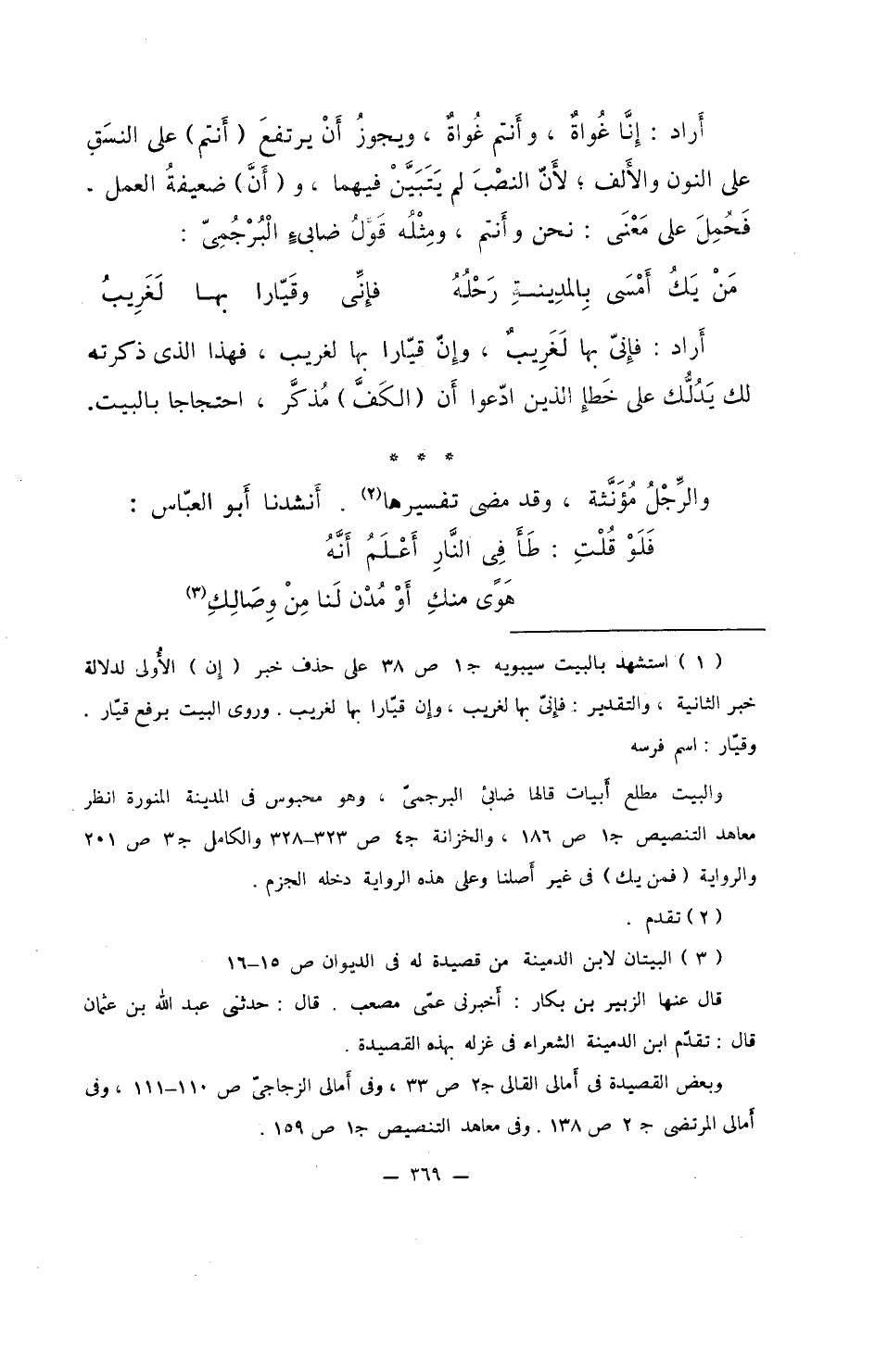 أراد: فإني بها لغريبٌ، وإن قيارا بها لغريب، فهذا الذي ذكرته لك يدُلُّك على خطإ الذين ادعوا أن (الكَفَّ) مُذكر، احتجاجاً بالبيت.