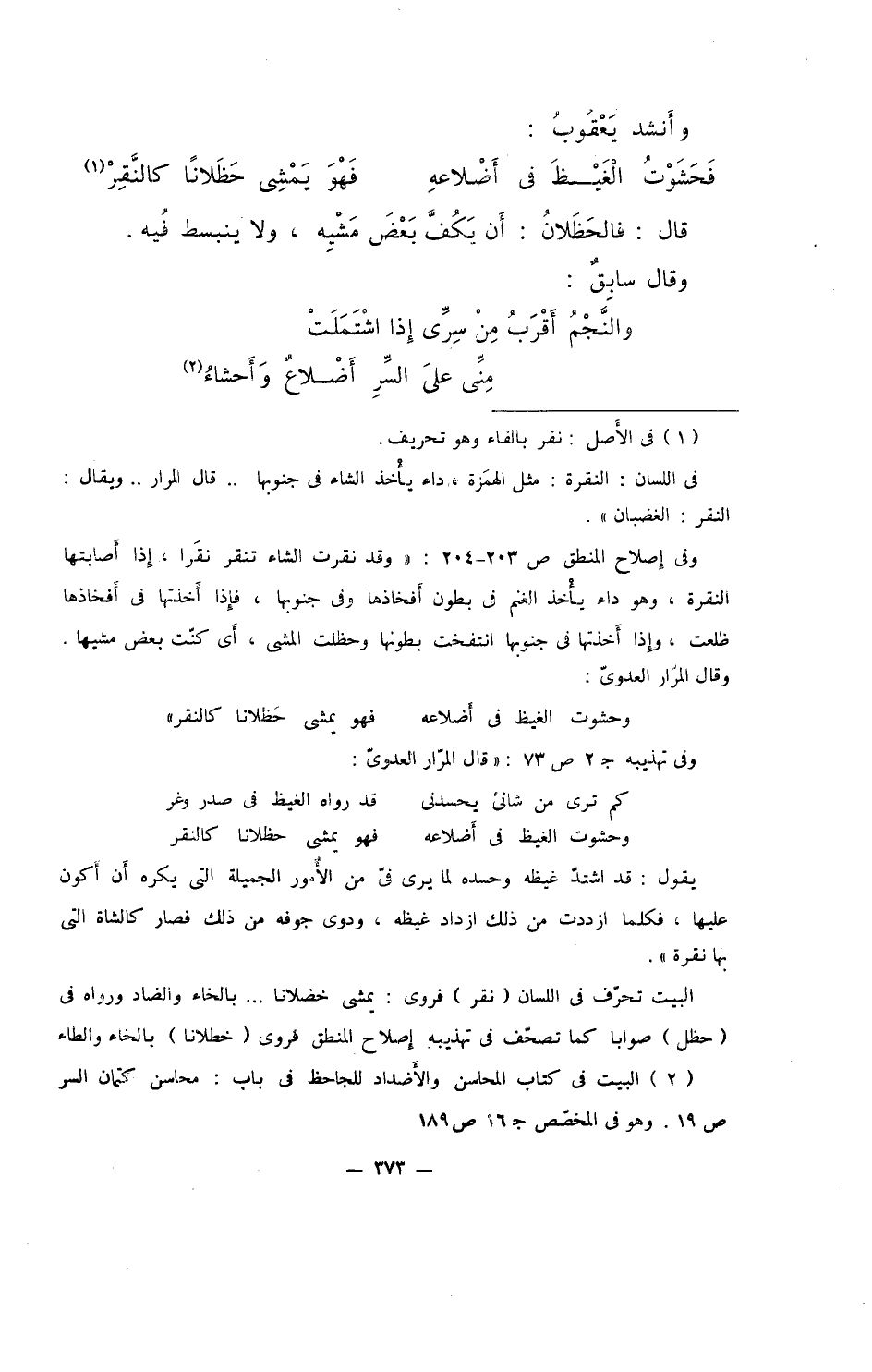 فحشوت الغيظ في أضلاعه ... فهو يمشي حظلاناً كالنقر