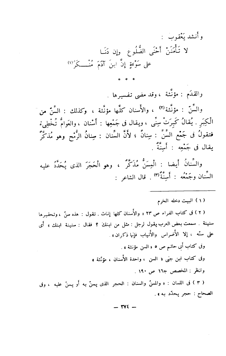 والسنٌ: مؤنثة، والأسنان كلها مؤنثة، وكذلك: السنِّ من الكبر. يُقال كبرتْ سني، ويقال في جمعها: أسنان، والعوام تخطيء فتقول في جمع السن: سِنانٌ؛ لأن السنان: سِنانُ الرمح وهو مُذكرٌ يقال في جمعه: أسِنَّةٌ.