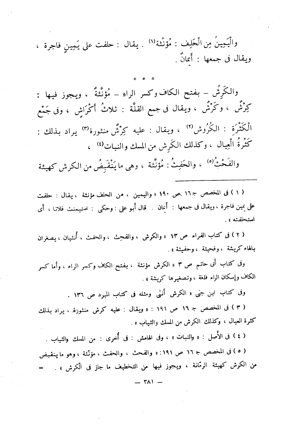 والكَرِشُ- بفتح الكاف وكسر الراء - مؤنثةٌ، ويجوز فيها: كِرْشٌ، وكَرْشٌ، ويقال في جمع القلة: ثلاثُ أكْرَاشٍ، وفي جمع الكثرةِ: الكُرُوش، ويقال: عليه كِرْشٌ منثورة يراد بذلك: كثْرةُ العيال، وكذلك الكَرِش من المسك والنبات.