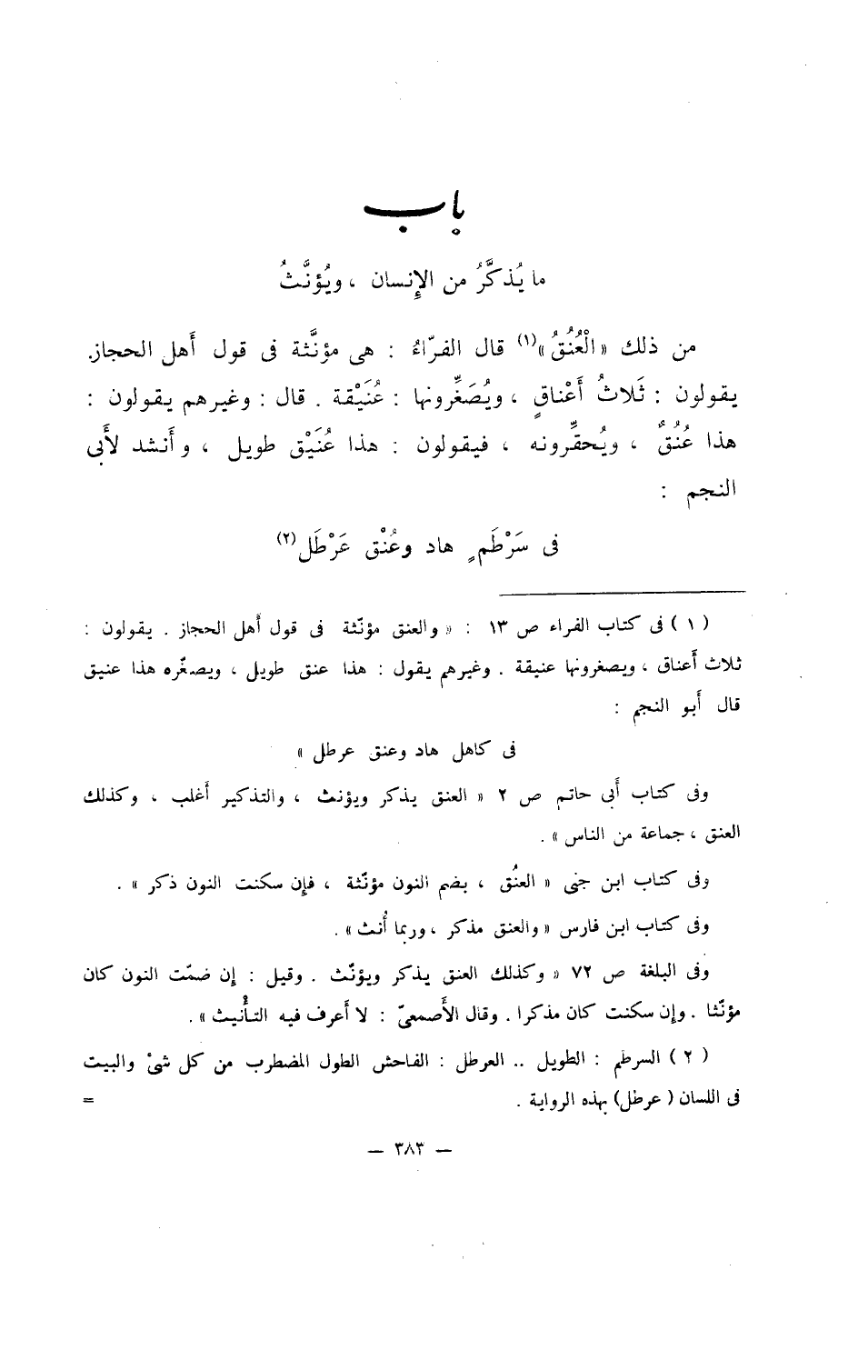من ذلك "العُنُقُ" قال الفراء: هي مؤنثة في قول أهل الحجاز. يقولون: ثلاثُ أعناقٍ، ويصغرونها: عُنَيْقة. قال: وغيرهم يقولون: هذا عُنُقٌ، ويحقرونه، فيقولون: هذا عُنَيْق طويل، وأنشد لأبي النجم: