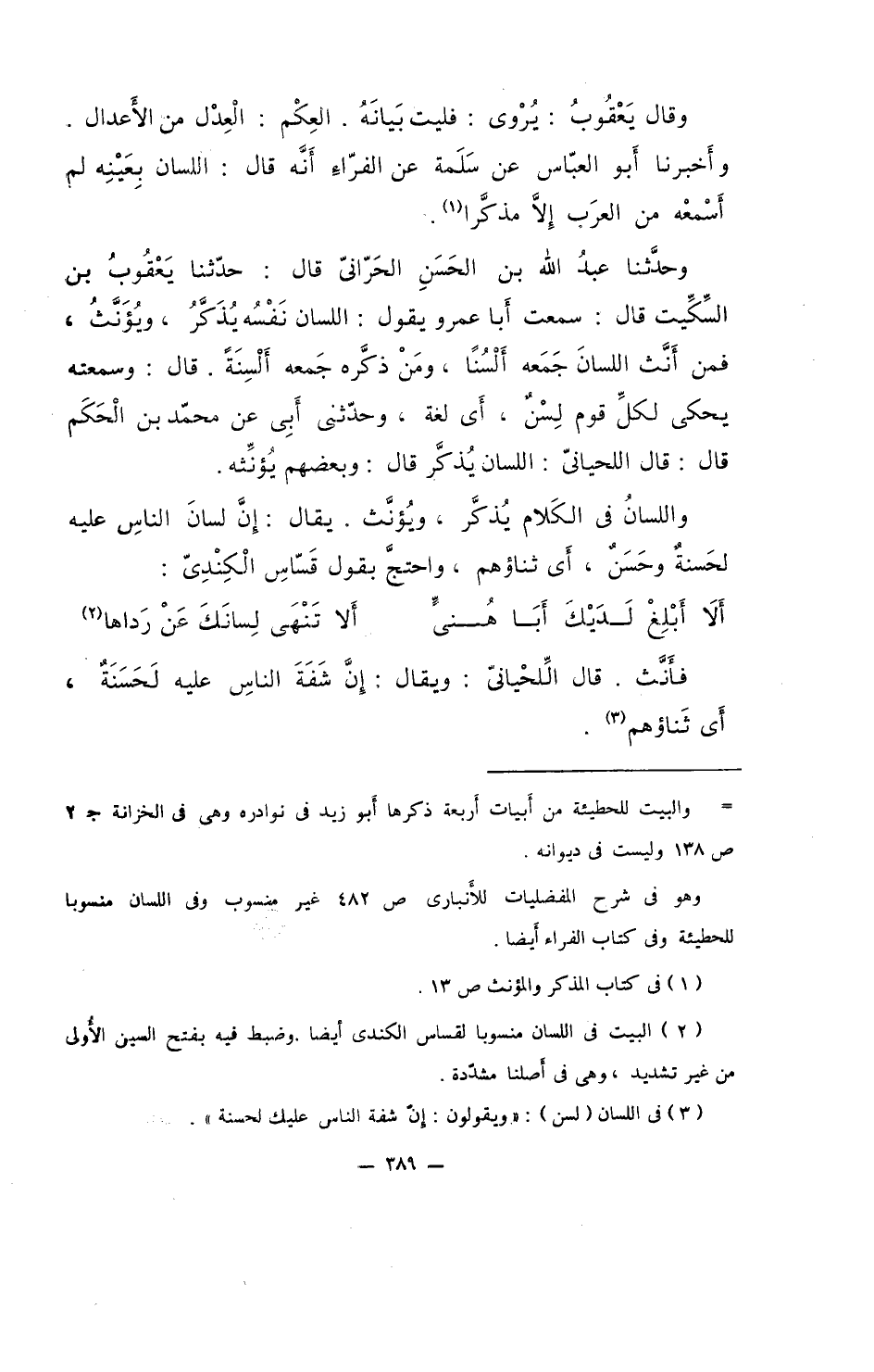 وحدثنا عبد الله بن الحسن الحراني قال: حدثنا يعقوبُ بن السكيت قال: سمعت أبا عمرو يقول: اللسان نفْسُه يُذكرُ، ويؤنثُ، فمن أنث اللسان جمعه ألْسُنَّا، ومنْ ذكره جمعه ألسنةً. قال: وسمعته يحكى لكل قوم لِسْنٌ، أي لغة، وحدثني أبي عن محمد بن الحكم قال: قال اللحياني: اللسان يُذكر قال: وبعضهم يؤنثه.