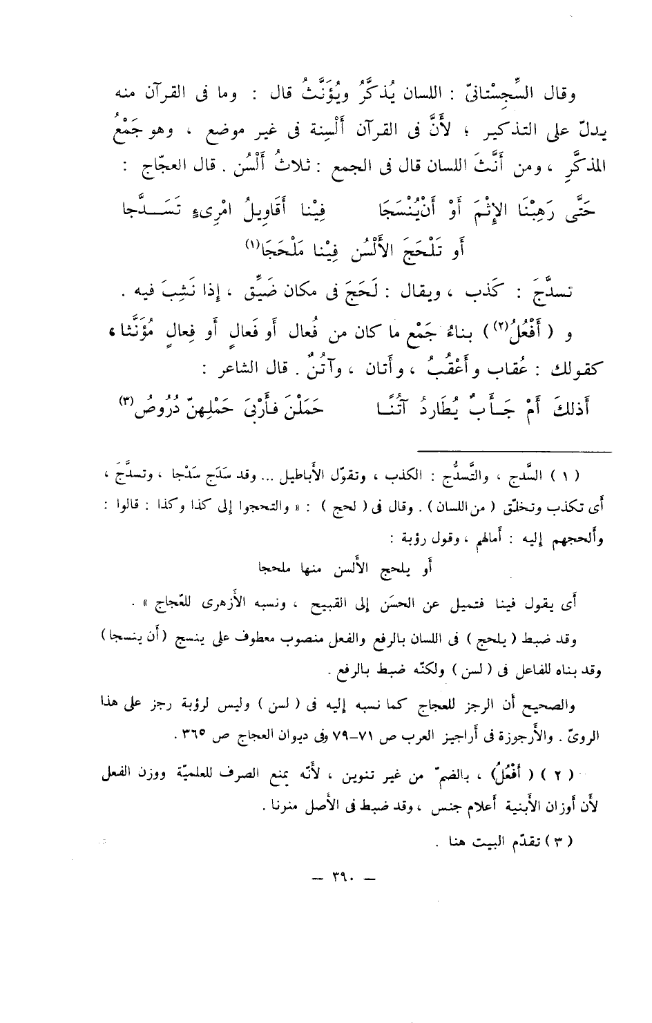 وقال السجستاني: اللسان يُذكر ويؤنثُ قال: وما في القرآن منه يدل على التذكير؛ لأن في القرآن ألسنة في غير موضع، وهو جَمْعُ المذكر، ومن أنث اللسان قال في الجمع: ثلاثُ ألسن. قال العجاج: