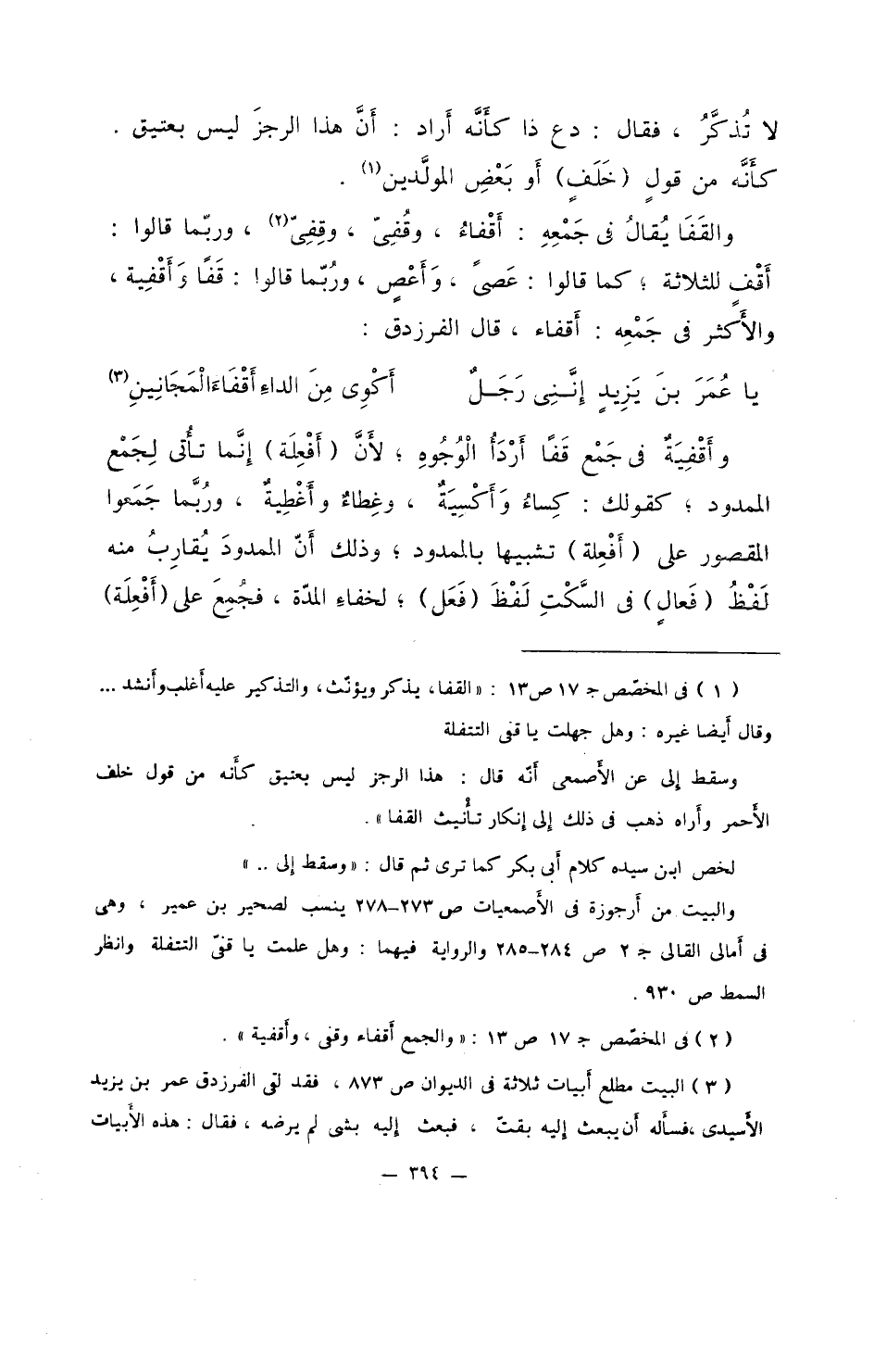والقفَا يُقالُ في جمعِهِ: أقْفاءُ، وقُفِيّ، وقِفِيّ، وربما قالوا: أقْفٍ للثلاثة؛ كما قالوا: عَصىّ، وأعْصٍ، وربما قالوا: قَفاً وأقفية، والأكثر في جمْعِه: أقفاء، قال الفرزدق: