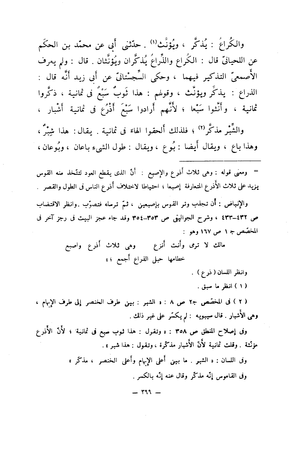 والكُراعَ: يُذكر، ويؤنث. حدثني أبي عن محمد بن الحكم عن اللحياني قال: الكُراع والذراعُ يُذكران وينثان. قال: ولمي عرف الأصمعي التذكير فيهما، وحكى السجستاني عن أبي زيد أنه قال: الذراع: يذكر ويؤنث، وقولهم: هذا ثوبٌ سبعٌ في ثمانية، ذكروا ثمانية، وأنثوا سبعا؛ لأنهم أرادوا سبعَ أذرُع في ثمانية أشبار.