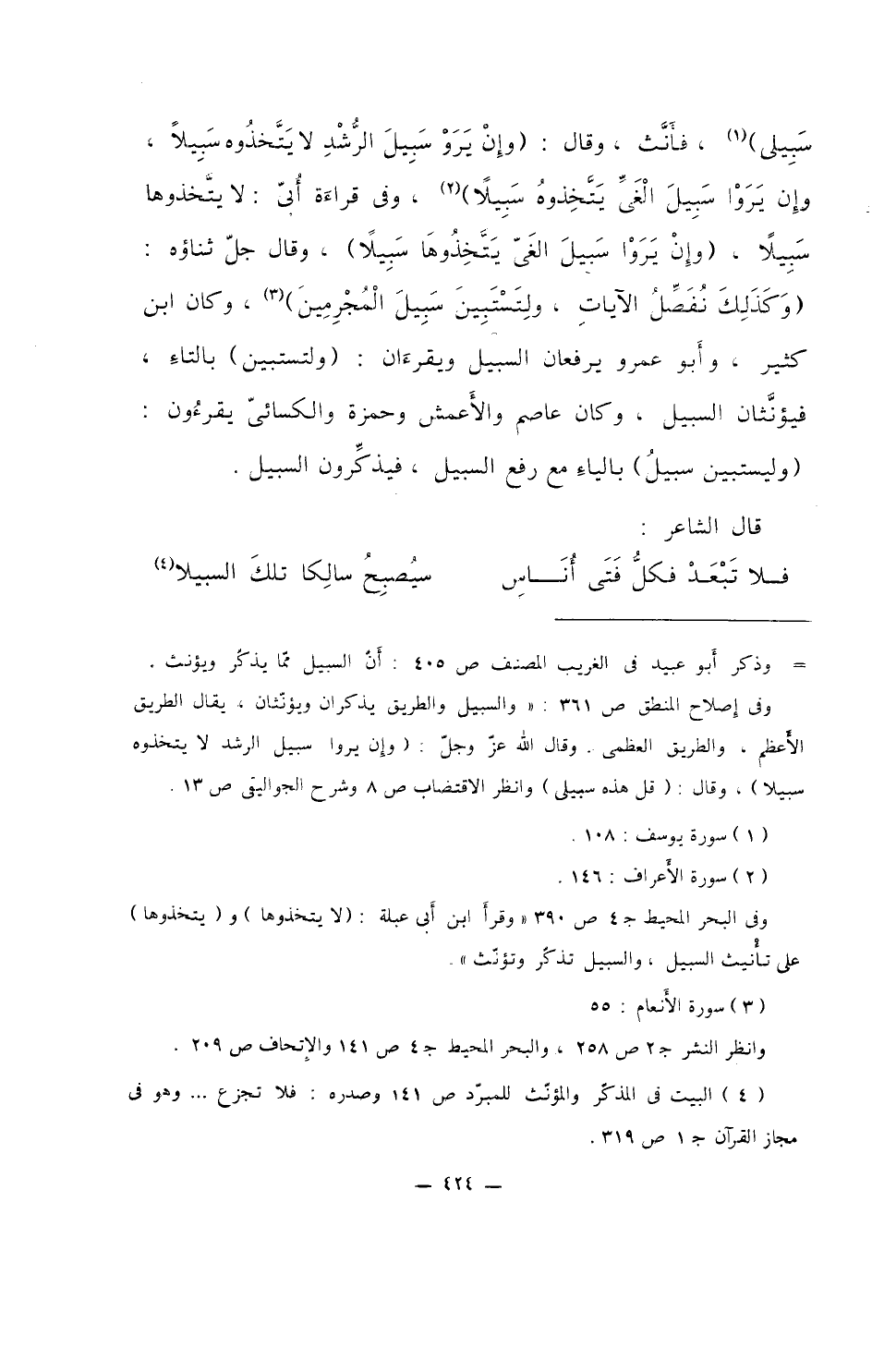 سبيلي)، فأنث، وقال: (وإنْ يرو سبيل الرشد لا يتخذوه سبيلاً، وإن يروا سبيل الغي يتخذوه سبيلاً)، وفي قراءة أبي: لا يتخذوها سبيلاً، (وإنْ يروا سبيل الغي يتخذوها سبيلاً)، وقال جل ثناؤه: (وكذلك نُفصل الآيات، ولتستبين سبيل المجرمين)، وكان ابن كثير، وأبو عمرو يرفعان السبيل ويقرءان: (ولتستبين) بالتاء، فيؤنثان السبيل، وكان عاصم والأعمش وحمزة والكسائي يقرءون: (وليستبين سبيلُ) بالياء مع رفع السبيل، فيذكرون السبيل.